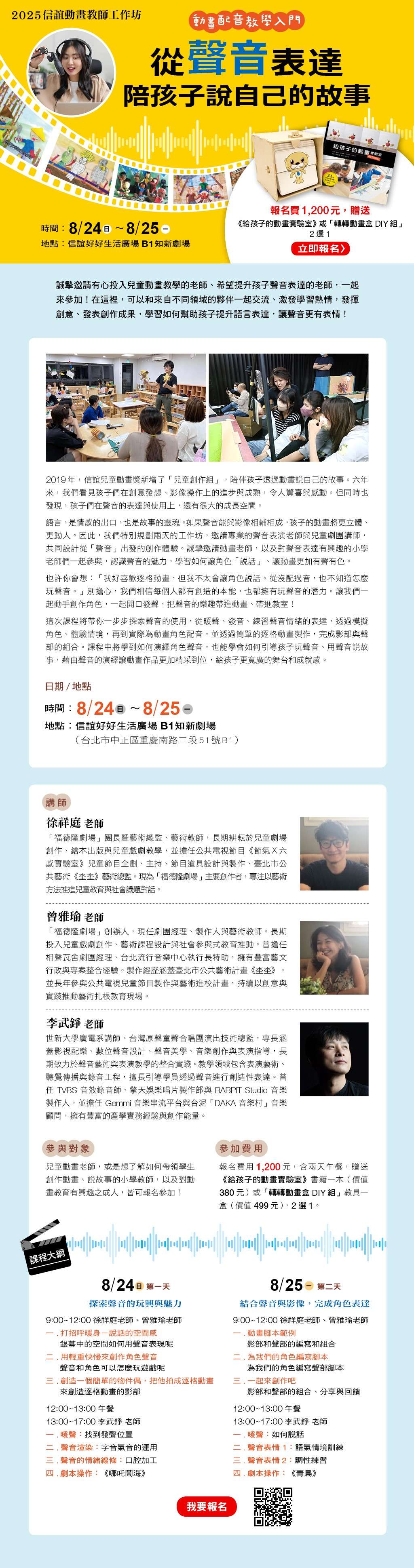 工作坊資訊如下: 時間:114年8月24日(日)及8月25日(一),上午9時至下午5 時,共兩天 地點:信誼好好生活廣場B1知新劇場(台北市中正區重慶南路二段51號B1)