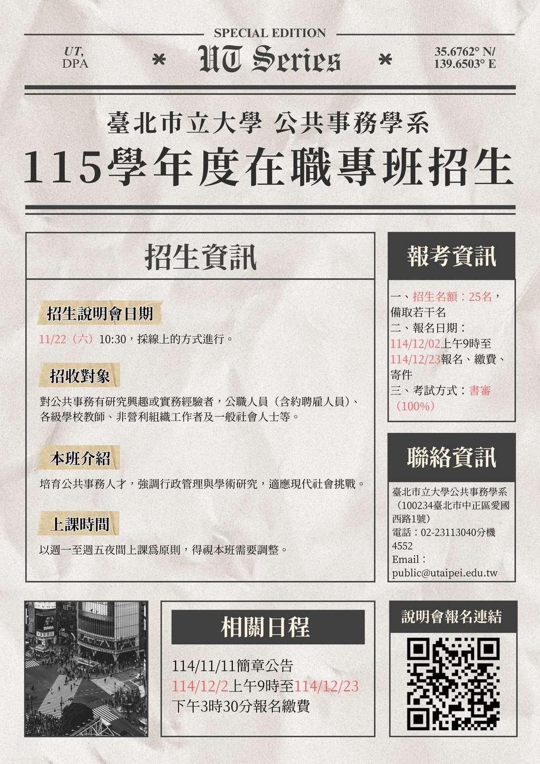 一、為培養公共事務人才,並鼓勵現職公務人員在職進修,充 實專業知能,該系特辦理 115 學年度在職專班招生。