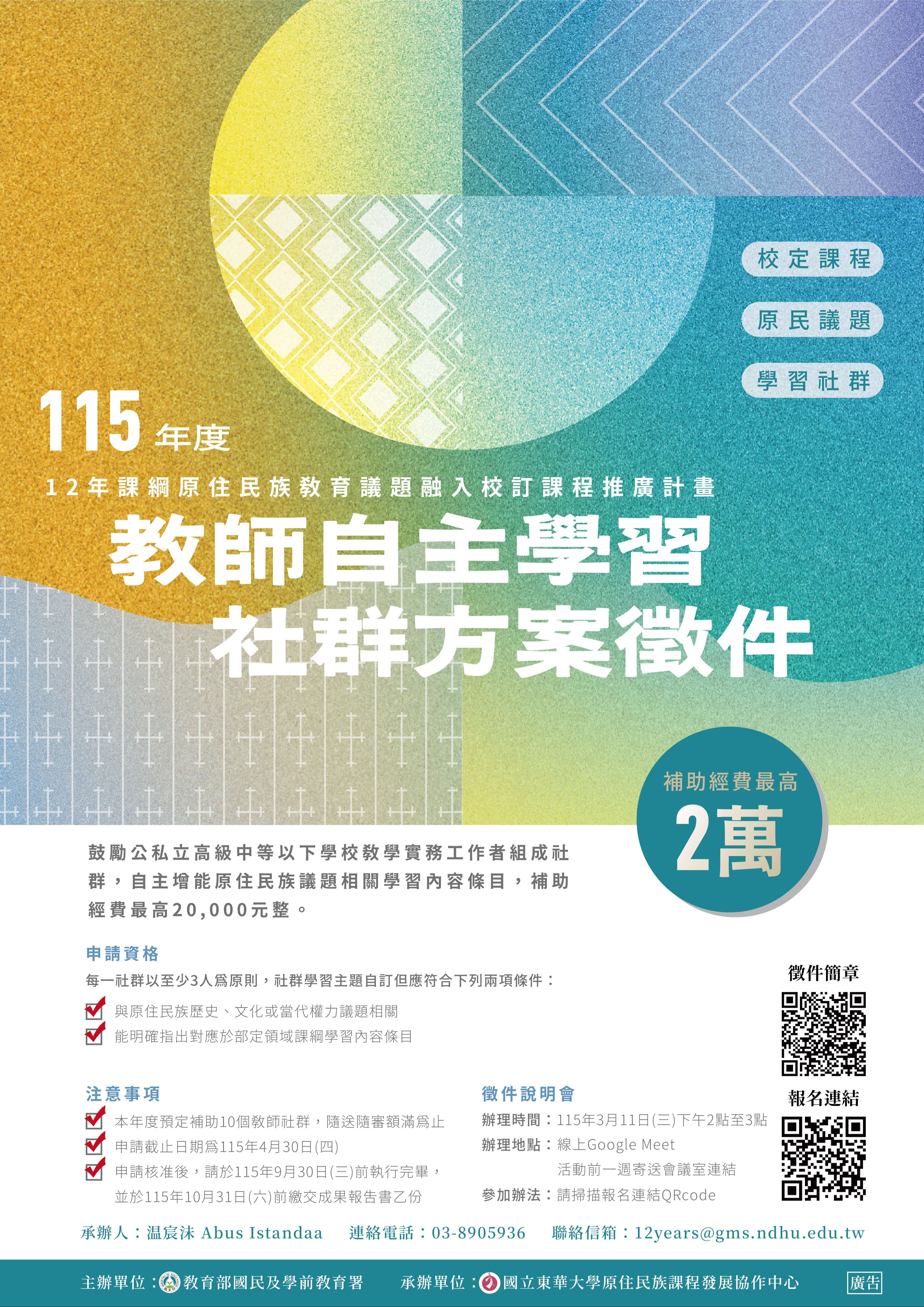 因應十二年國教課綱正式實施,為協助教師及學校落實原 住民族議題融入各學習領域及課程,爰辦理旨揭方案,補 助教師組成學習社群,進行相關學習內容之自主增能,以 提升教師對原住民族教育議題之理解,並推動全民原住民 族教育理念之落實。