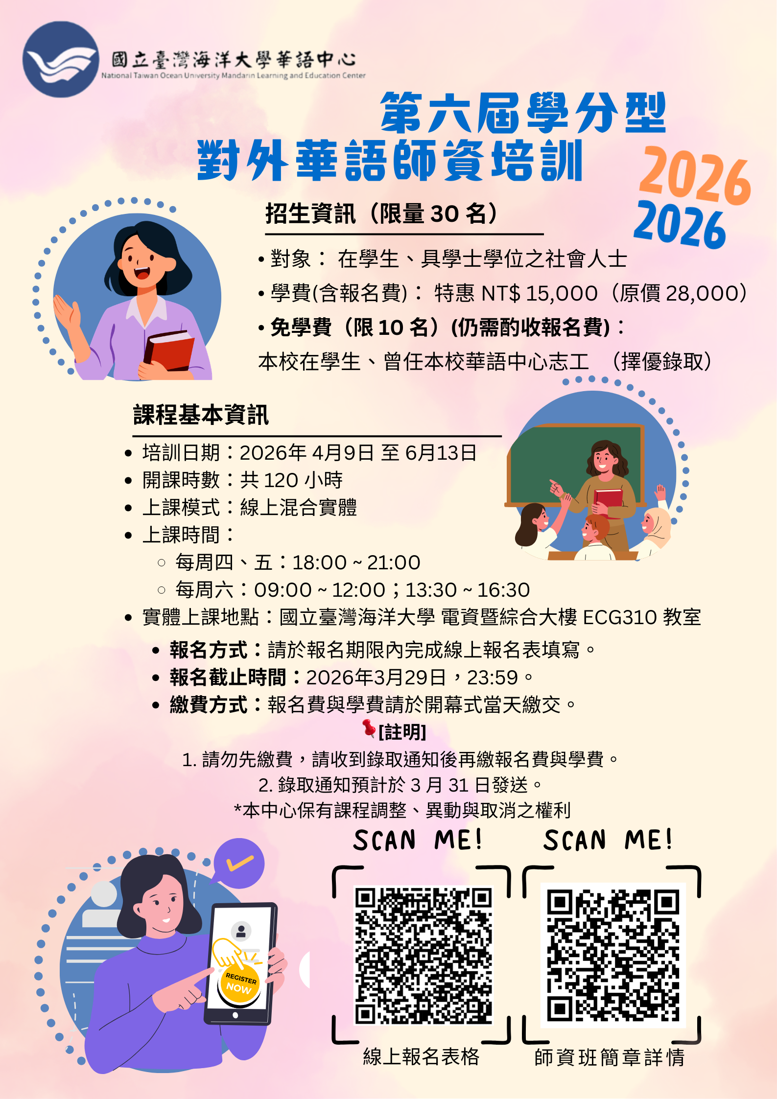報名方式:請於115年3月29日23:59前完成線上報名填寫 ,錄取通知預計於3月31日以Email發送(未錄取者將不另通 知),詳情請參中心官網https://r083.ntou.edu.tw/以 及本中心粉絲專頁https://www.facebook.com /NTOUxCLC。