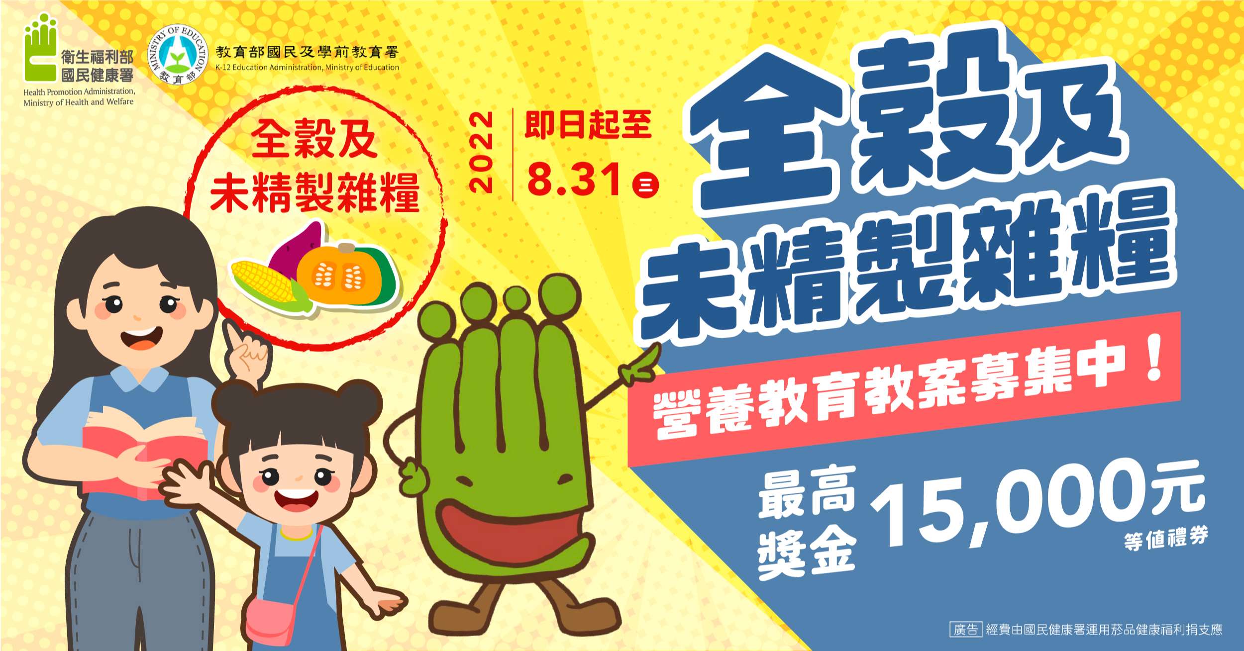 三、為鼓勵教職人員發展適合教學之教案及教材,以期共同推動全穀及未精製雜糧營養教育,提升孩童對於全穀及未精製雜糧知能,進而提升攝取,爰辦理 「全穀及未精製雜糧教案徵件」活動,最高獎金高達1萬5,000元,歡迎國小及幼兒園教職人員踴躍參加。