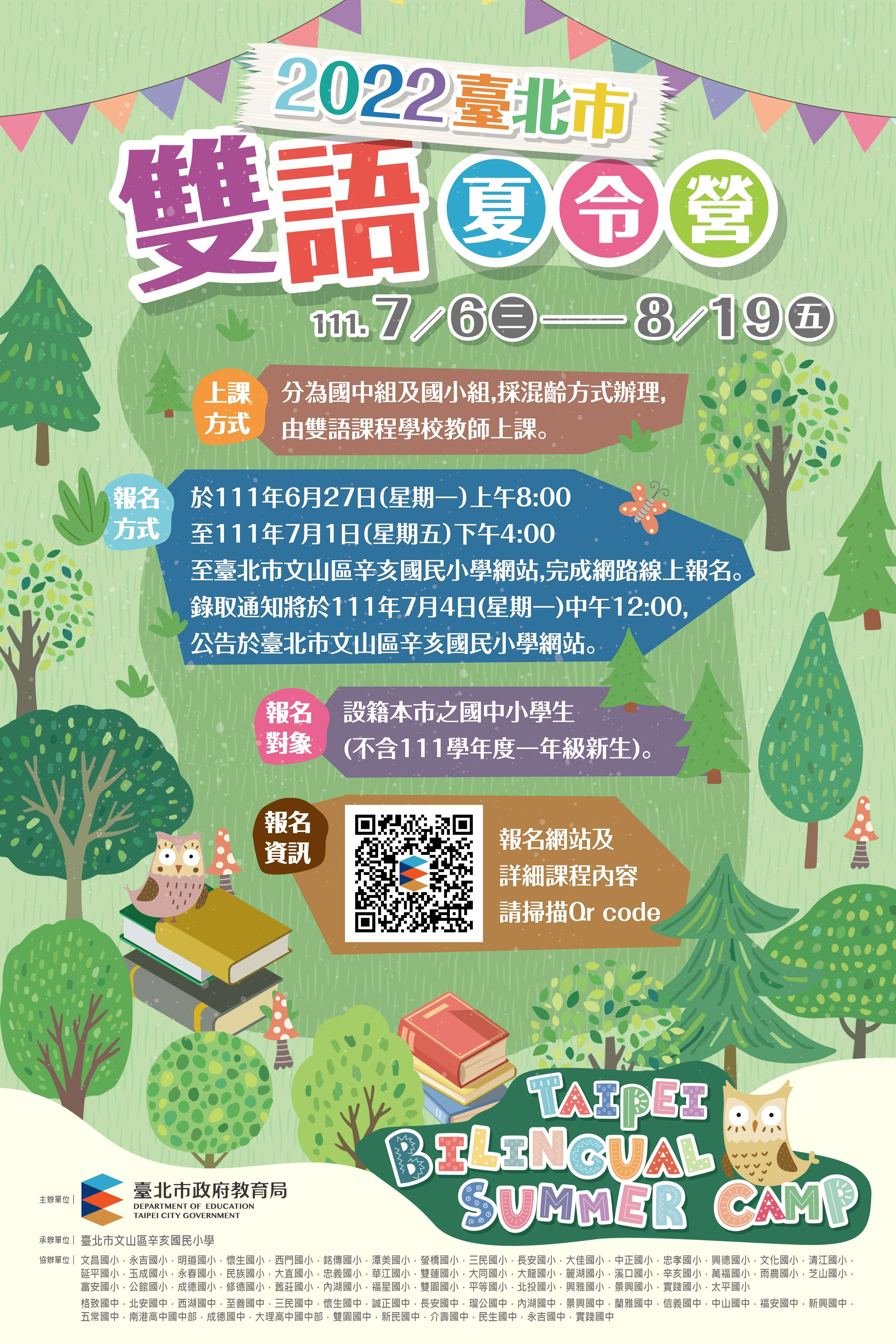 報名方式 (一)報名對象:採全市不分區方式辦理。國小學生家長逕自 選擇本市核定之國小雙語課程學校,六年級畢業生及國中學生家長逕自選擇本市核定之國中雙語課程學校。每名學生至多可報名2場次。 (二)報名時間:於111年6月27日(星期一)上午8時至111 年 7月1日(星期五)下午4時,報名期間可至臺北市文山區 辛亥國小網站(http://gg.gg/2022ESC),完成線上報 名,逾期不受理。