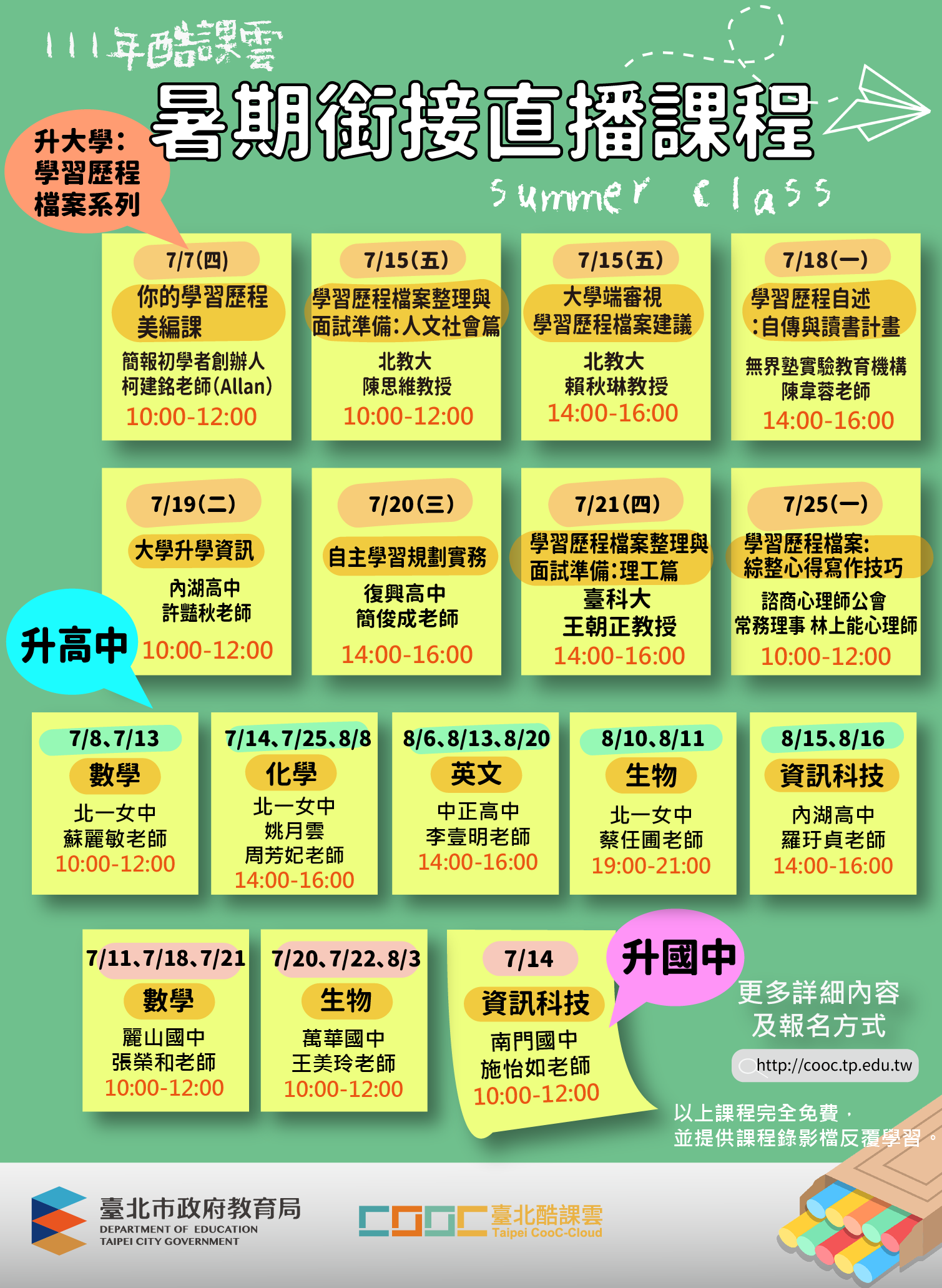 二、本課程實施時間自111年7月7(星期四)至8月20日(星期六) 止,詳細科目及直播時間請參閱計畫(如附件),或於臺北酷課雲「酷課OnO線上教室」銜接課程專區(網址: https://ono.tp.edu.tw/)取得詳細資訊。
