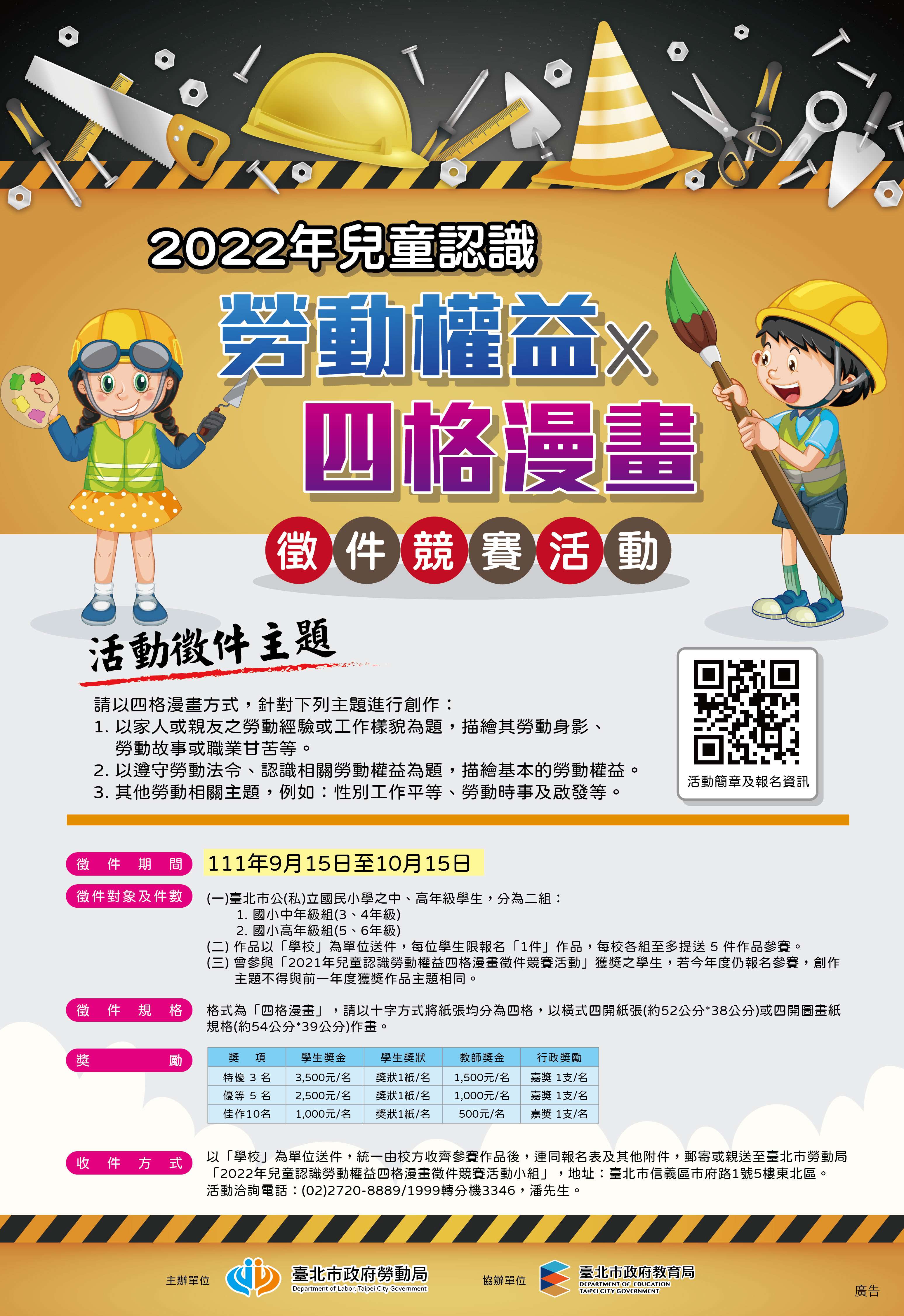 三、如果有送件相關疑問,請聯繫主辦單位(02)2720-8889/1999分機3346,勞動教育文化科承辦人潘先生,電子郵件:DL-00202@mail.taipei.gov.tw。