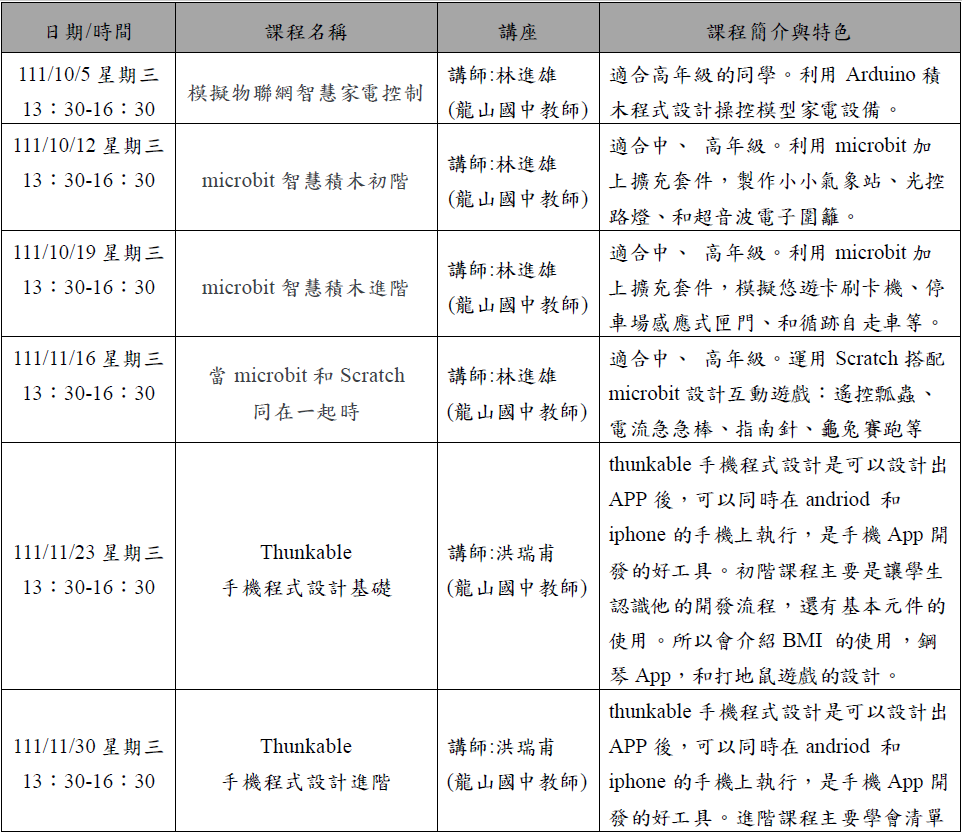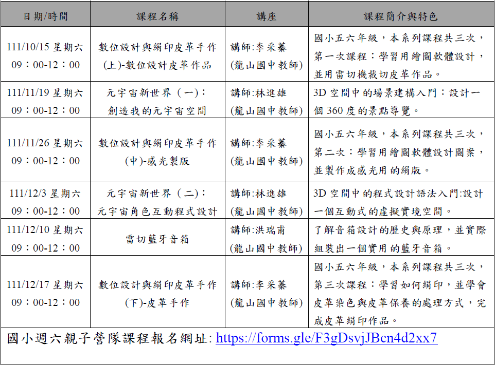 龍山自造教育及科技中心辦理「111學年度第1學期國小週三學生體驗課程暨週六親子體驗課程」,歡迎學生/親子報名參加