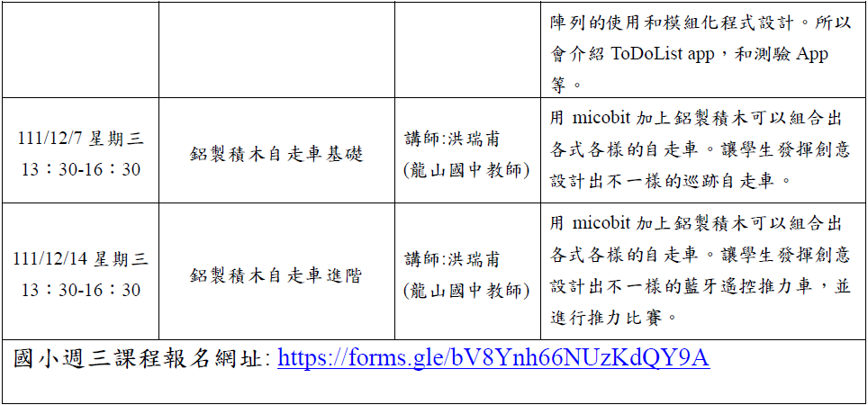 (一)國小週三體驗課程報名網址:https://forms.gle/bV8Ynh66NUzKdQY9A。