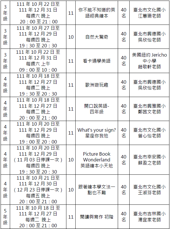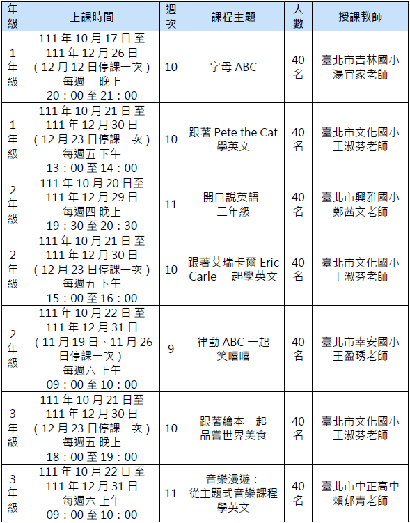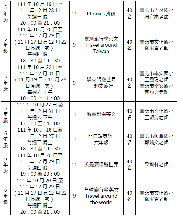 (二)課程活動時程: 自 111 年 10 月 17 日(星期一) 起至 111 年 12 月 31 日(星期六)止,每門每週開設 1 堂課 1 小時 ,皆開設 9-11 週,並限額 40 名學生參加,共計 23 門國小英語線上直播課程。