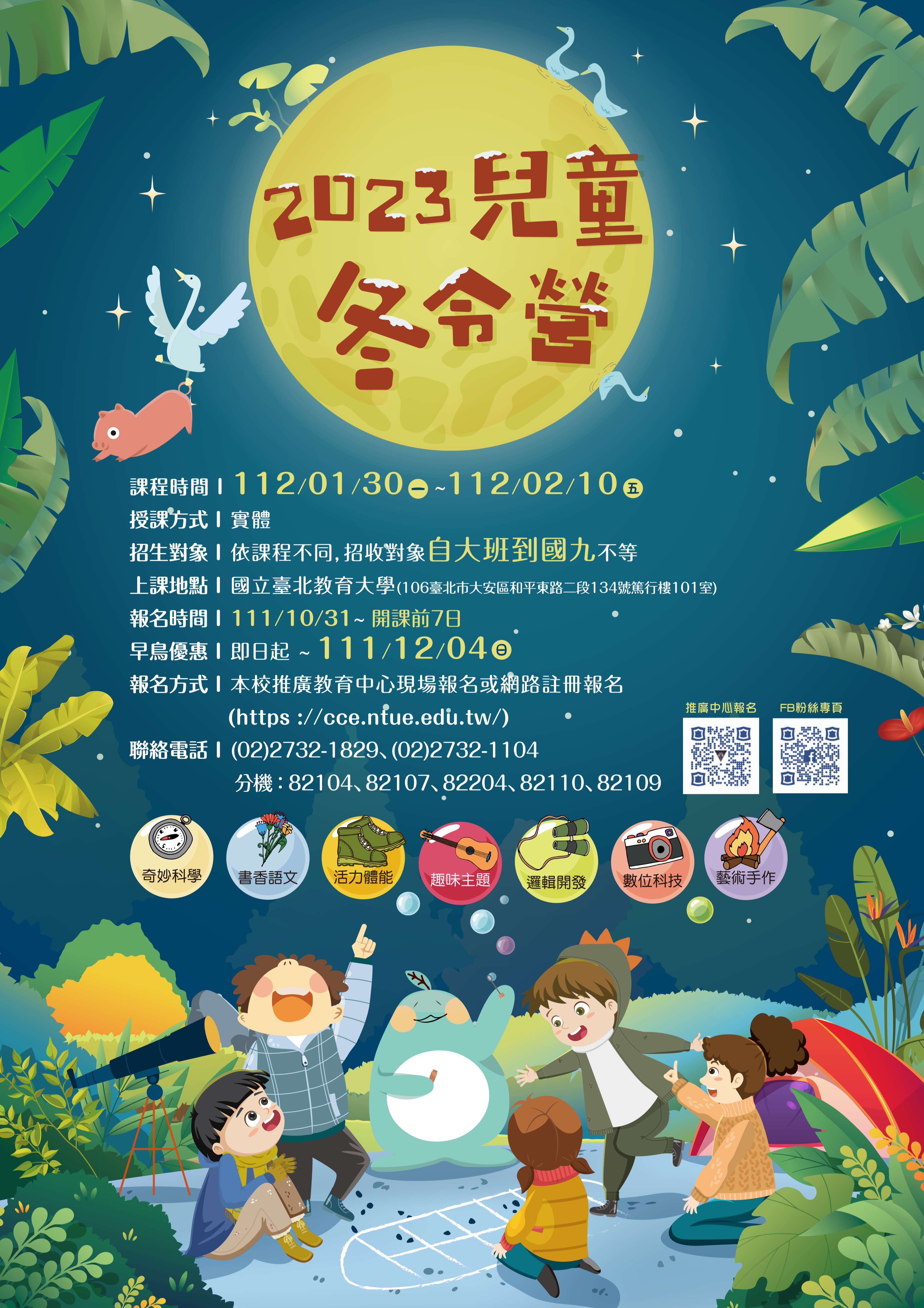 一、旨揭「2023兒童冬令營」謹訂於112年1月30日至2月10日, 課程詳細資訊請至國北進修推廣處推廣教育中心網站 (https://cce.ntue.edu.tw/)查詢。