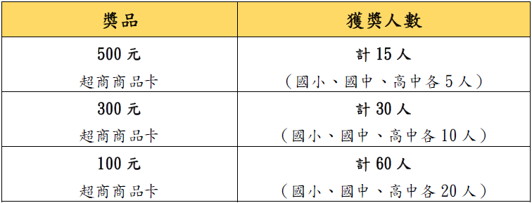(一) 依活動任務說明完成學習單者即具有抽獎資格,經審核後以電腦系統亂數抽出以下獎項: