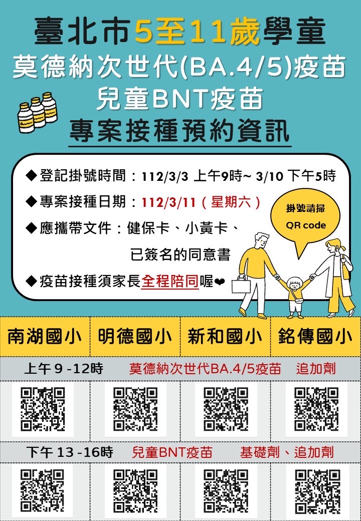 1、上午9時至12時:兒童莫德納次世代BA.4/5疫苗(滿6 歲至11歲),提供追加劑(第3劑)