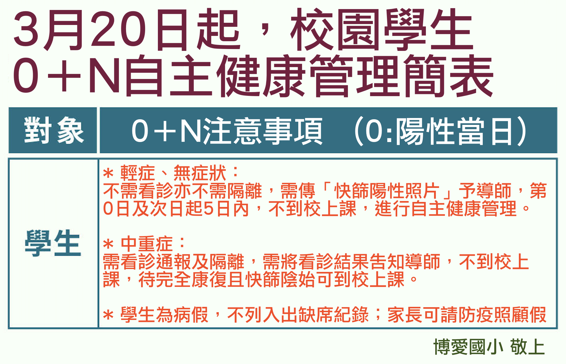 最大的重點為:輕症或無症狀,不再需要視訊看診,但還是需要通知導師,局裡考量學校多為近距離且為群聚型活動,故確診學生請進行0+5的自主健康管理(不到校上學,但可正常作息及外出)