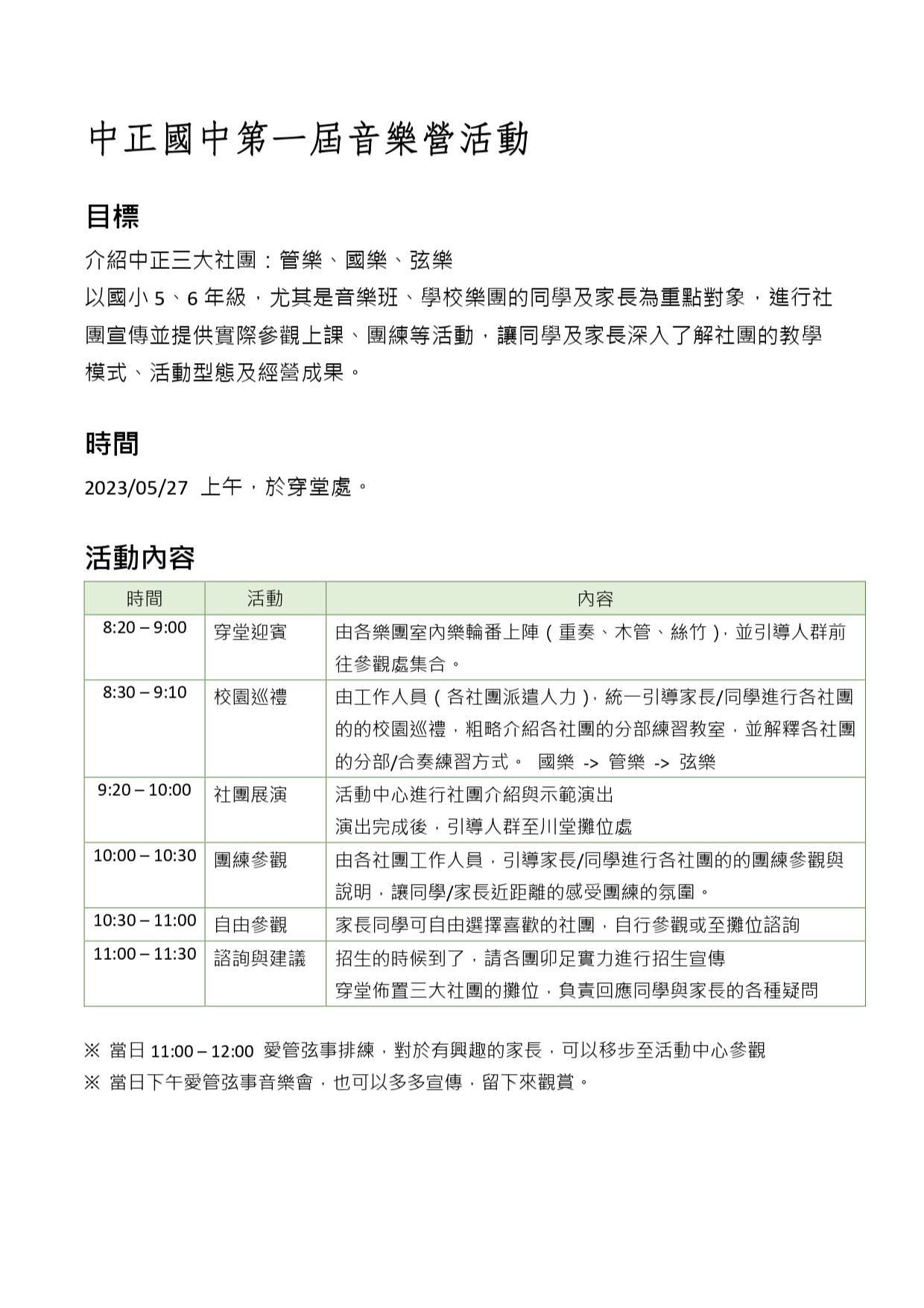 一、活動目標:宣傳臺北市立中正國民中學弦樂、國樂及管樂特色。