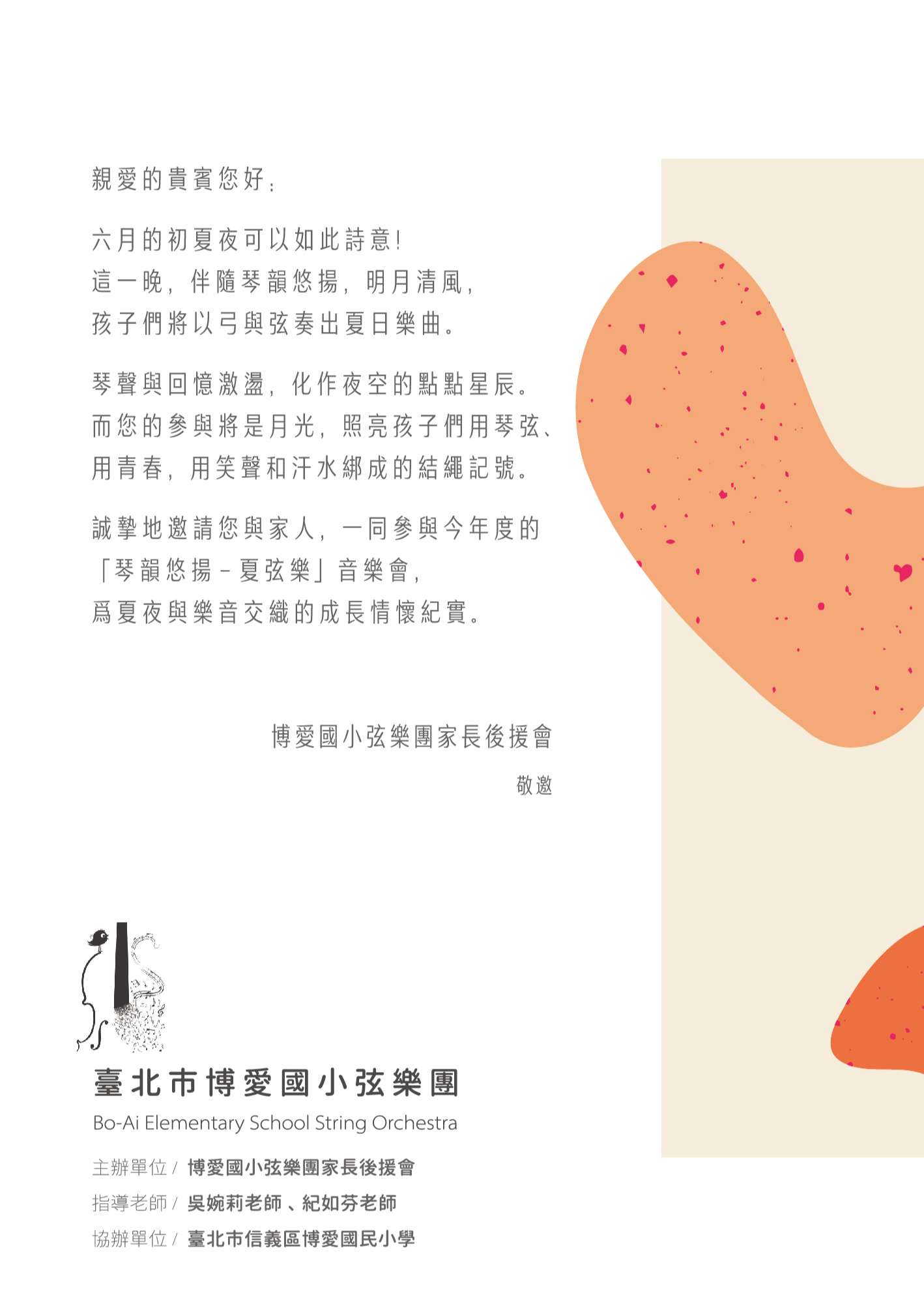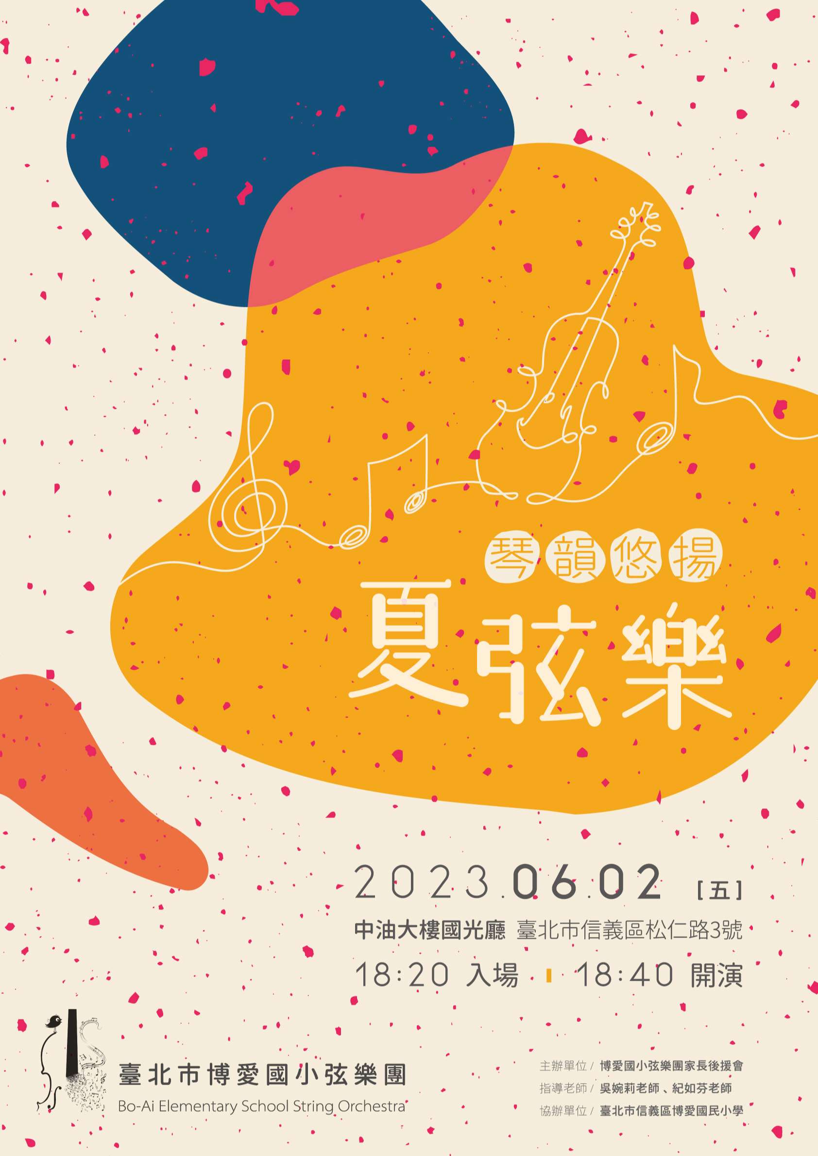 一、本校博愛國小弦樂團,定112年6月2日(五)於中油大樓國光廳舉辦「琴韻悠揚 - 夏弦樂」音樂會。