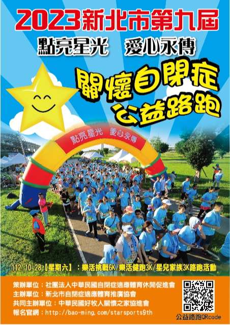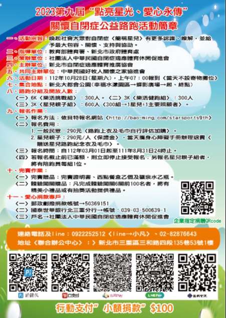 轉知2023新北市第九屆“點亮星光、愛心永傳”關懷自閉症公益路跑活動簡章〈DM〉乙份,鼓勵踴躍報名參加!