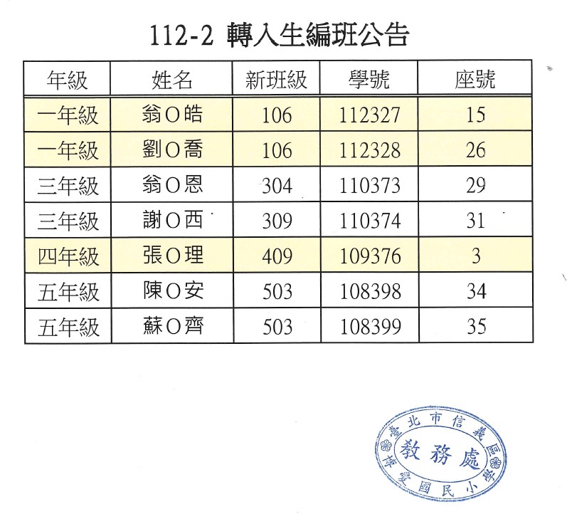 112學年度第二學期轉入生編班公告如下,開學2/16(星期五)當天7:50請至新班級報到。