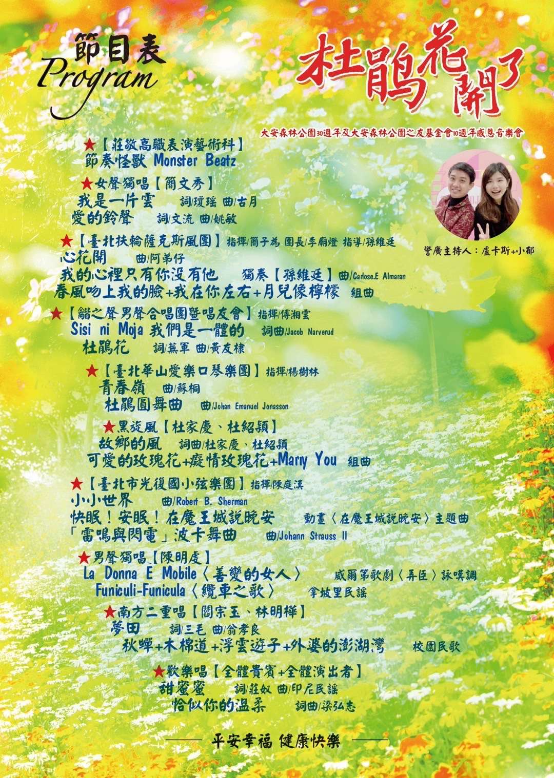 一、被譽為城市之肺的大安森林公園開園迄今屆滿30周年,而長年致力於公園保育及維護的大安森林公園之友基金會也成立10周年,為了慶賀生態環境守護有成,特結合今年 「臺北杜鵑花季」舉辦音樂會活動。