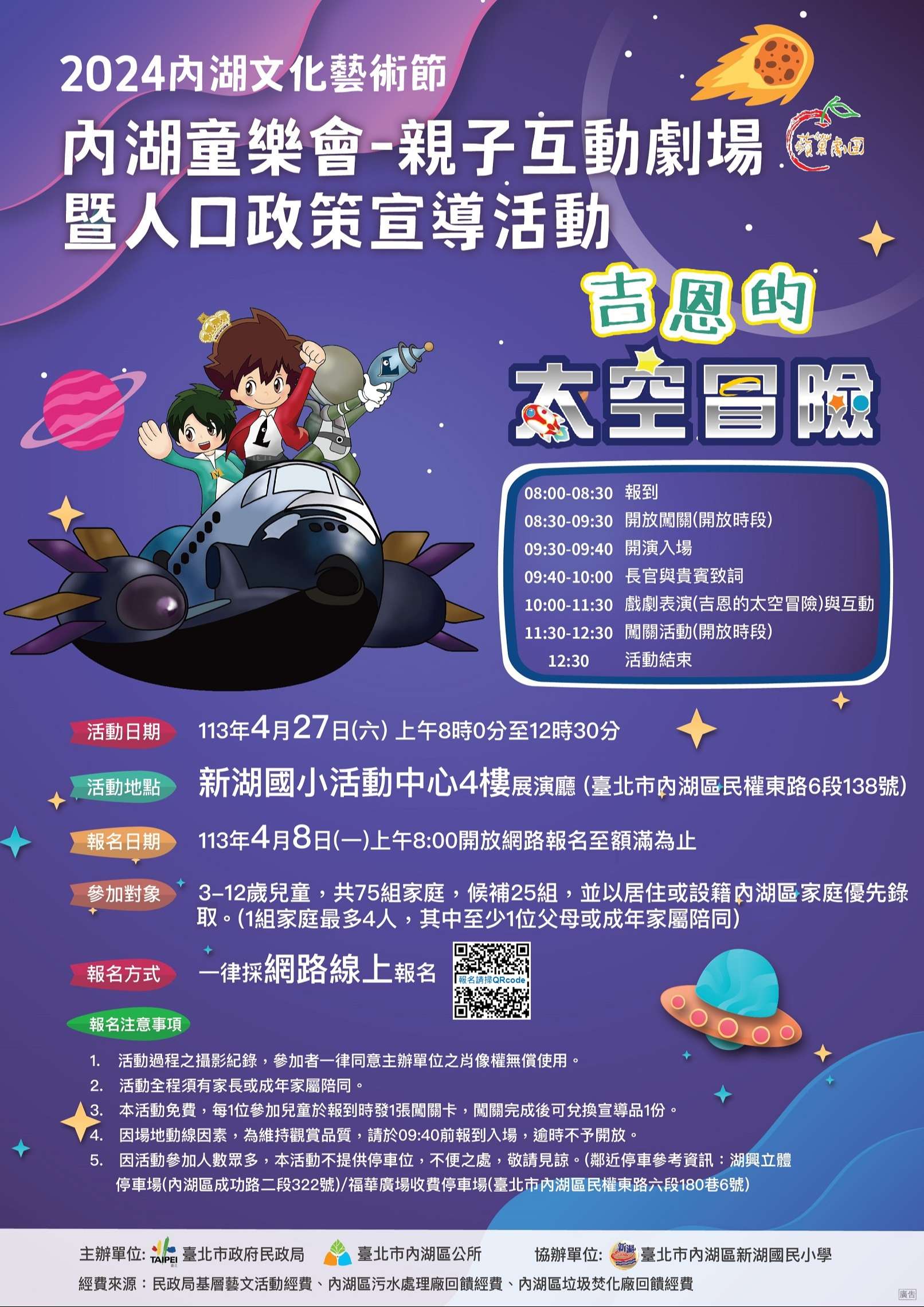 二、臺北市內湖區公所於4月27日(六) 8時 0分至12時30分,於臺北市內湖區新湖國民小學活動中心舉辦2024年內湖文化藝術節「內湖童樂會-親子互動劇場」暨人口政策宣導活動,當日邀請知名蘋果劇團表演「吉恩的太空冒險」,現場還有4種各具特色的童玩闖關遊戲,歡迎爸爸媽媽們帶寶貝「一起童樂」, 113年4月8日上午8時起開放網路報名,額滿為止,名額有限,詳情請參閱內湖區公所網站。報名網址:https://www.beclass.com/rid=284d7c165fb90c44e079。