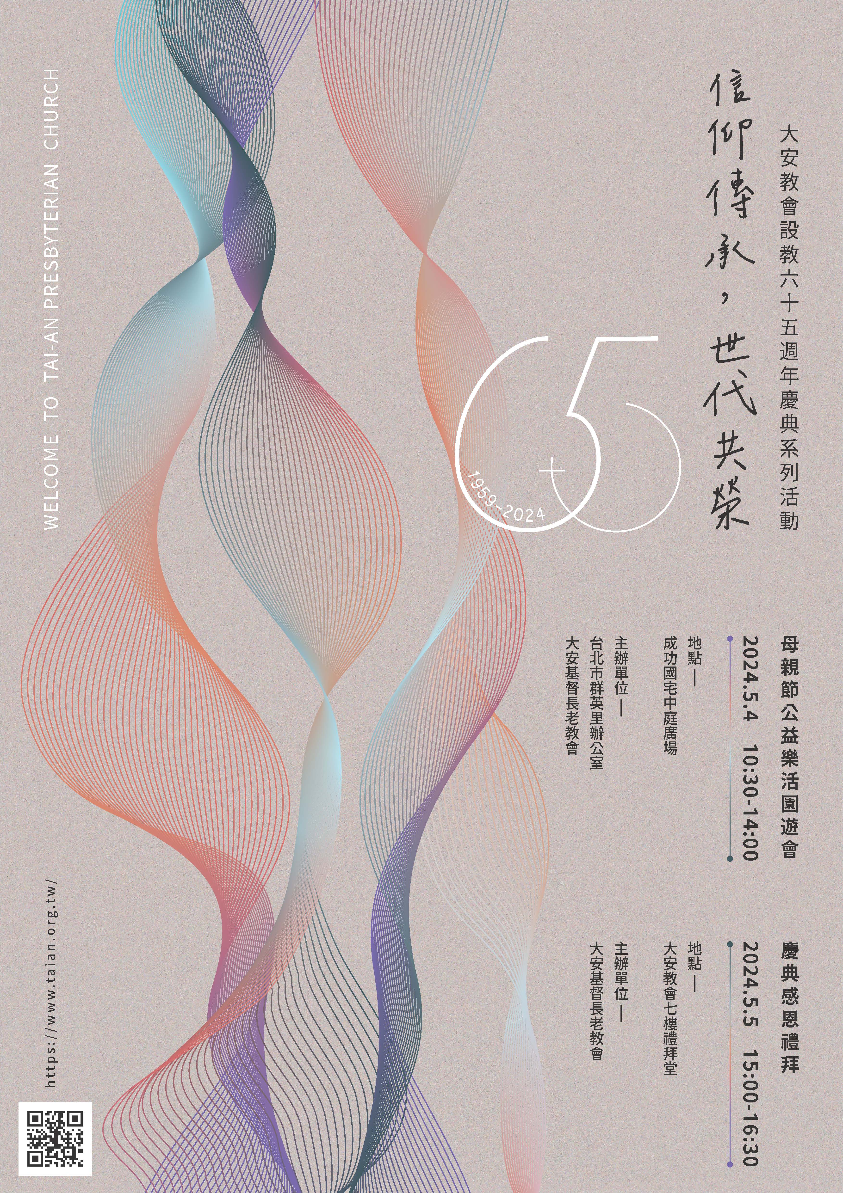 台北大安基督長老教會65週年慶典系列之公益園遊會,為與更多的社區居民分享喜樂,此次園遊會與群英里里辦公室合辦,適逢五月母親節前夕,以母親節公益樂活園遊會為主軸,將於5月4日上午10:30在成功國宅中庭廣場舉行。