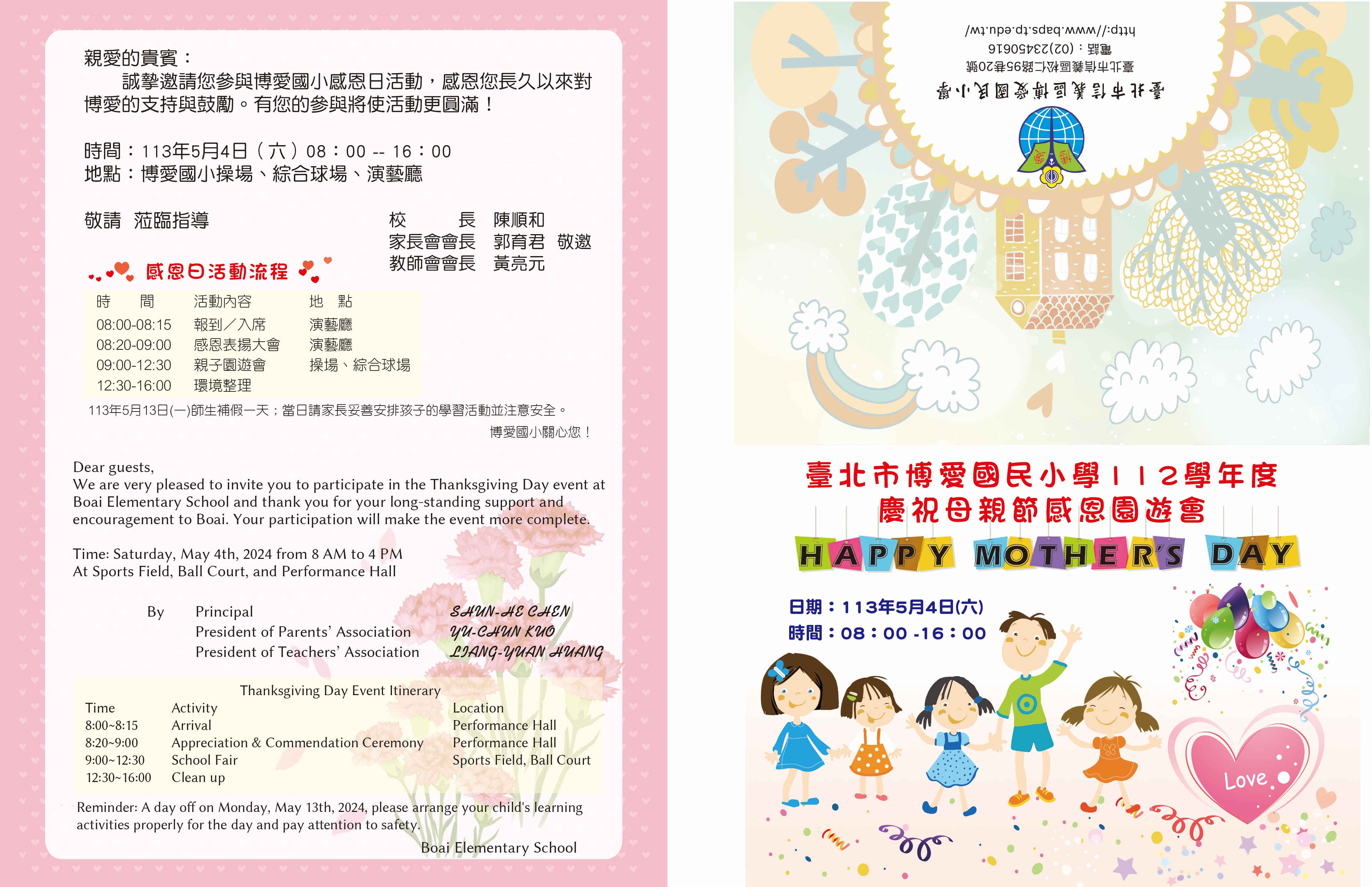 5/4(週六)博愛國小將舉辦感恩園遊會,歡迎大家一同來逛攤位,感受一下熱鬧的氣氛喔!詳細流程請參閱邀請函。