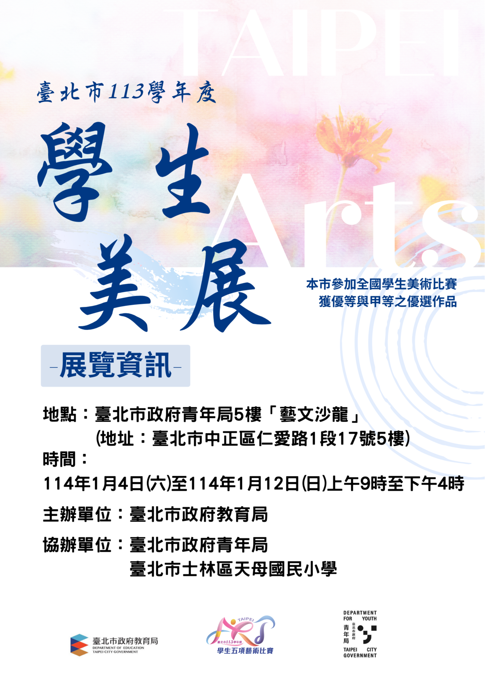 二、為提供優秀作品展示及相互交流機會,並激勵其持續發揮 創意與創作,豐富臺北詮釋,提升本市藝文之能見度及競爭力,臺北市政府教育局特與臺北市政府青年局共同舉辦旨揭學生美展;展覽資訊如下