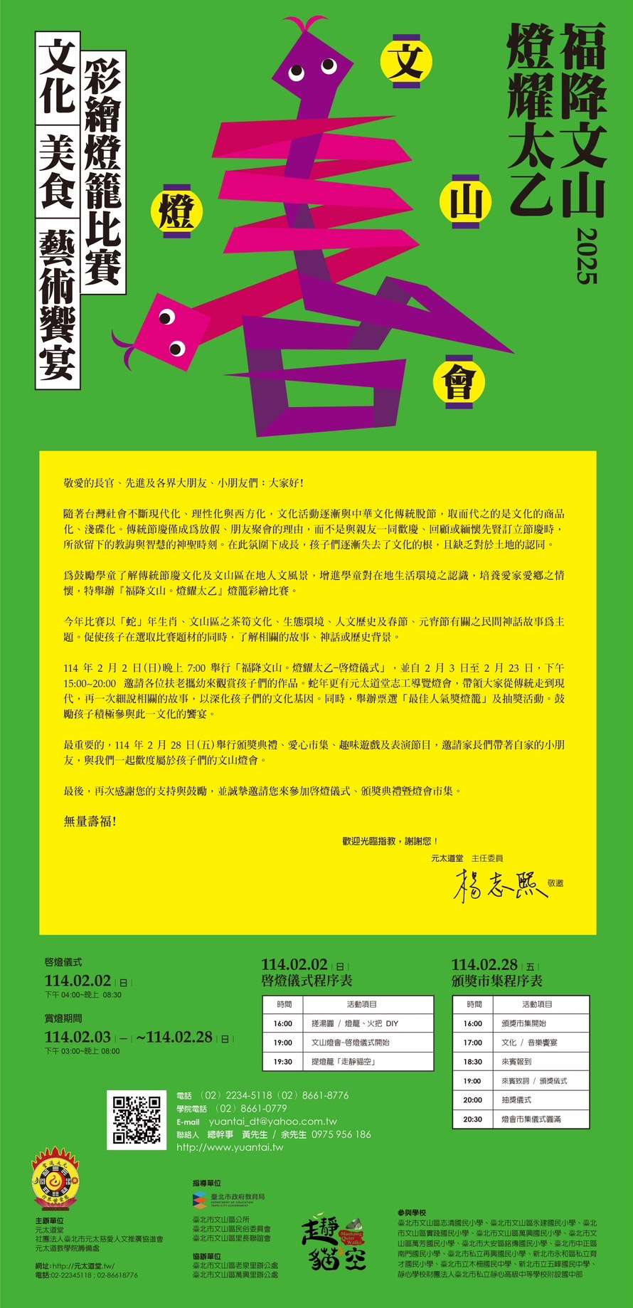 (一)點燈儀式:114年2月2日下午4時至6時,屆時將安排傳統元宵燈節搓元宵、持火把、走靜貓空等活動。