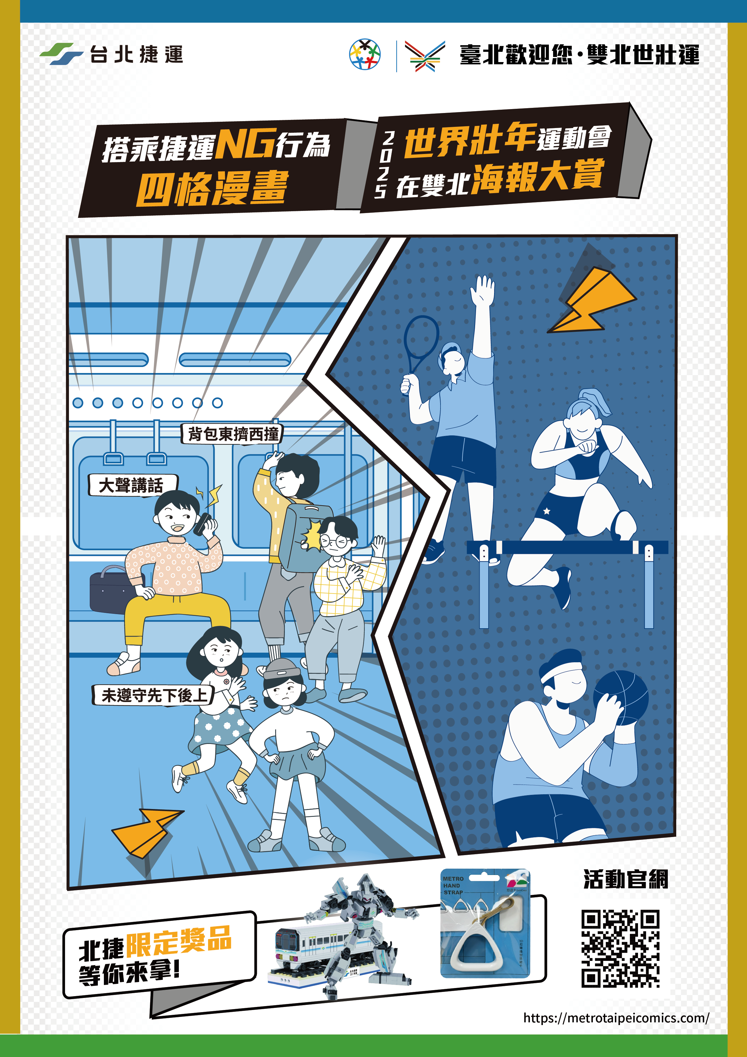 二、臺北大眾捷運股份有限公司辦理漫畫徵稿活動,期能透過孩童視角呈現捷運上的NG行為,讓孩童在參與中學習並培養良好乘車禮儀;另為慶祝雙北市主辦 2025年世界壯年運動會,同時推出宣傳海報徵選活動,歡迎全民發揮創意,共襄盛舉。