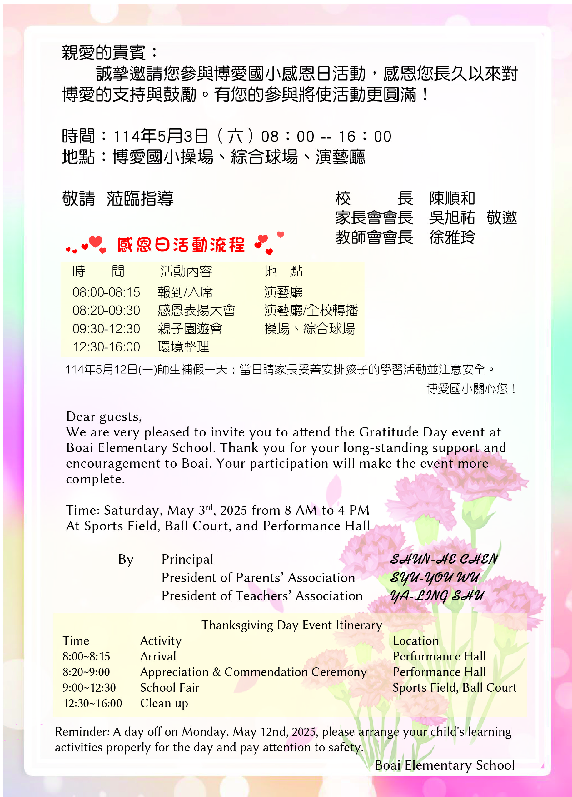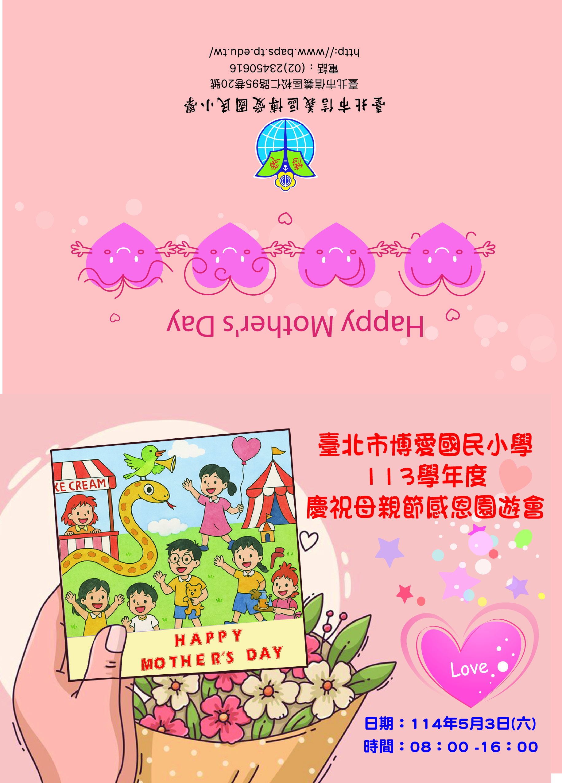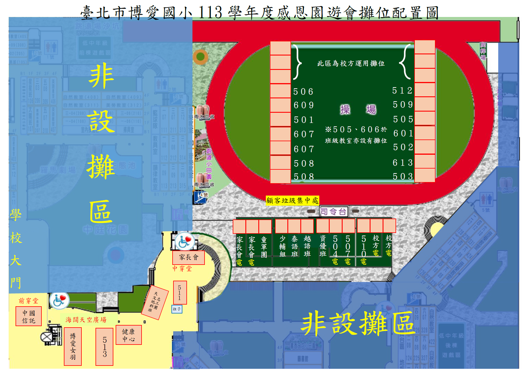 各位家長: 5/3週六,本校將舉辦母親節感恩園遊會,歡迎大家和孩子一同前來,感受溫馨熱鬧的氣氛,攤位大約8:30以後會陸續開始開設,附件為當天攤位配置圖,歡迎參考。