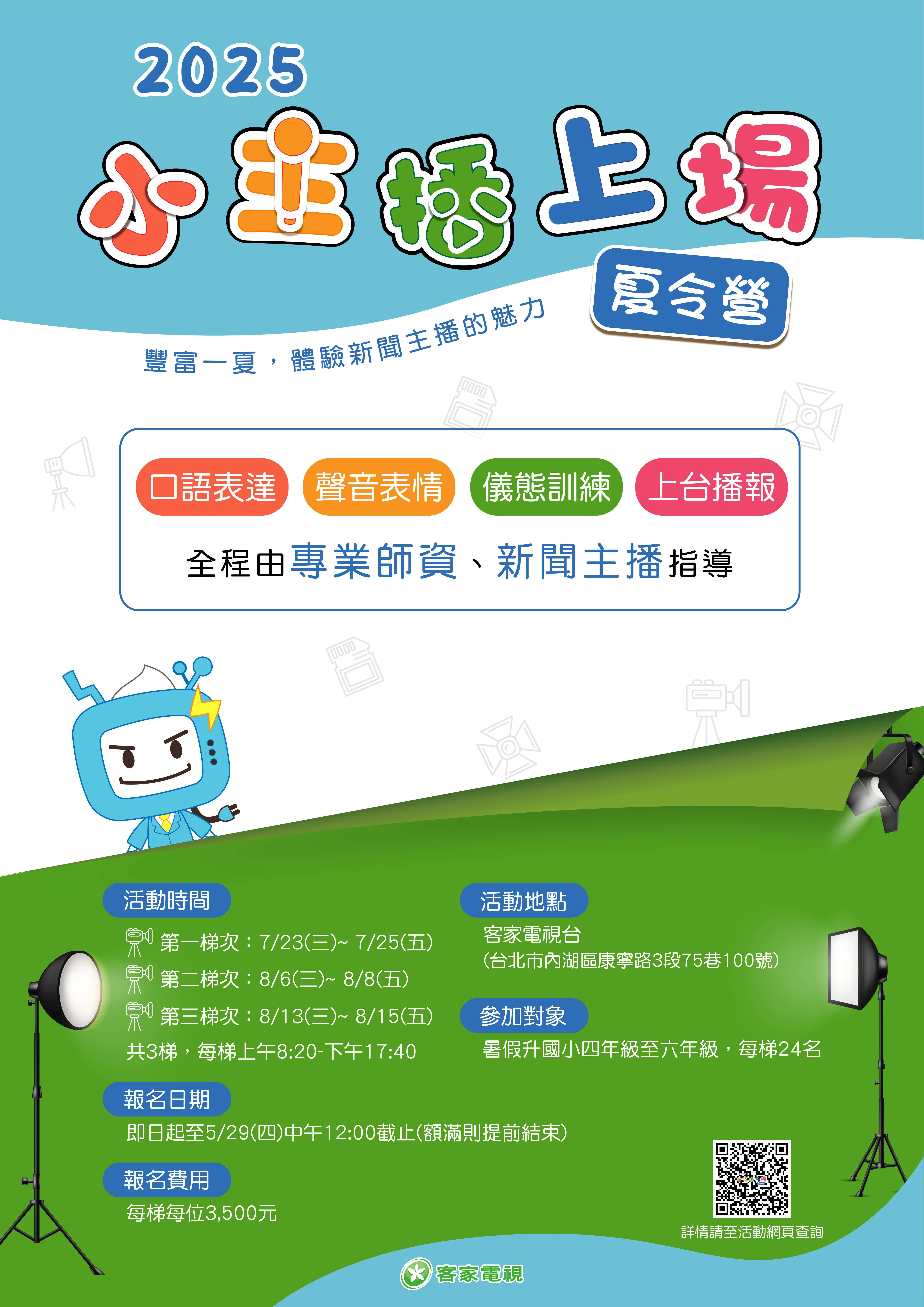 一、為增進學童媒體素養、語言表達能力及團隊合作精神,並透過分組學習與實際演練,體驗新聞製作及主播播報技 巧,財團法人公共電視文化事業基金會客家電視特於暑期舉辦「2025客家電視小主播上場夏令營」,針對暑期後國小四到六年級學生設計內容, 並邀請專業講師及新聞主播進行授課。