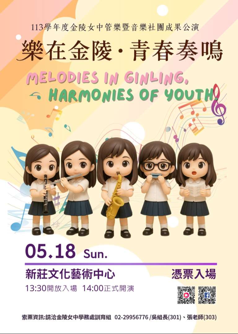 四、表演團隊:金陵女中管樂團、合唱團、曲笛社、口琴獨奏 (全國學生音樂比賽特優第一名)、英語歌唱(本校雙語精進班榮獲新北市英唱比賽特優)、欣響室內管樂團。
