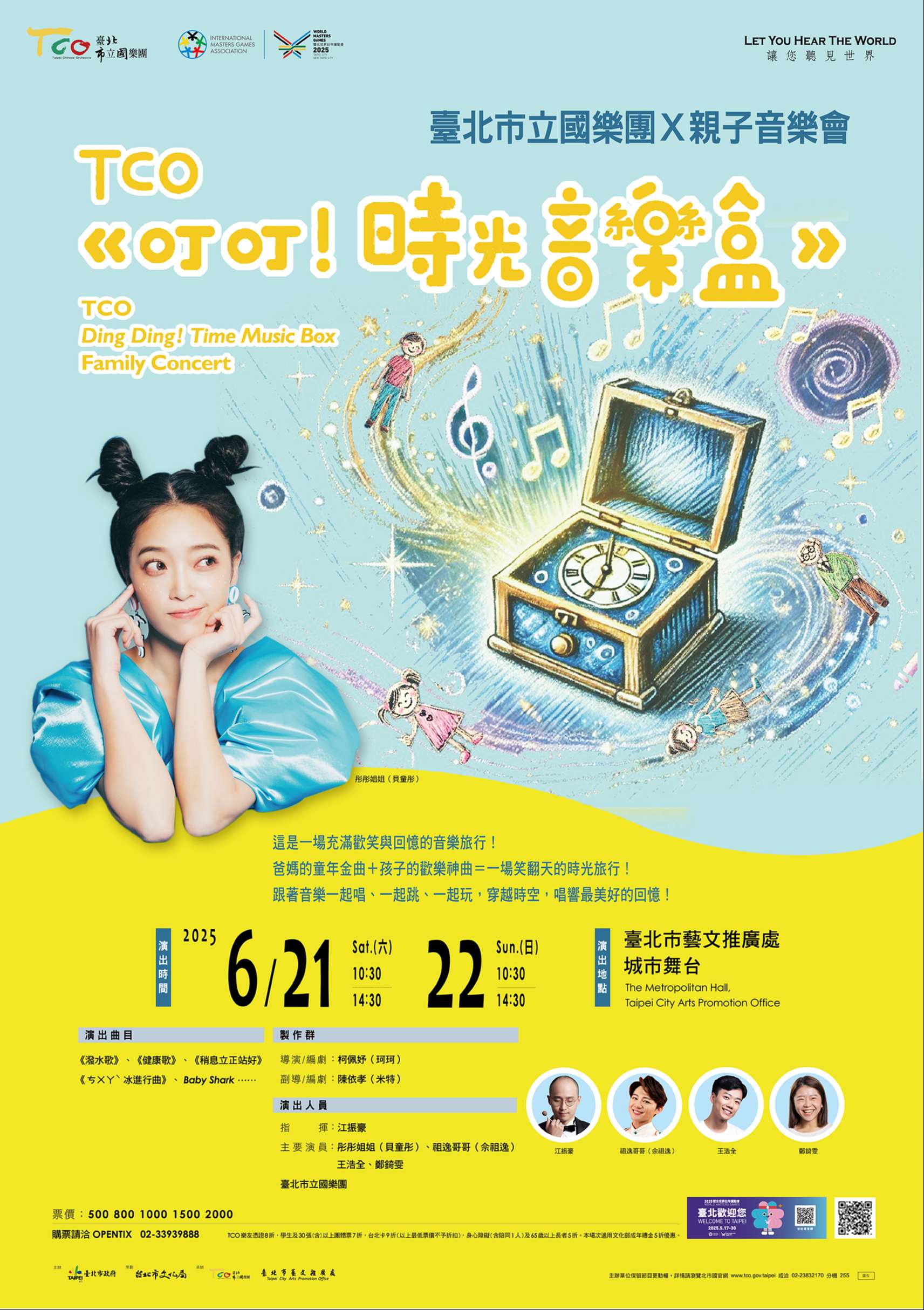 一、臺北市立國樂團將於114年6月21日、22 日假臺北市藝文推廣處城市舞台演出《叮叮!時光音樂 盒》親子音樂會。特別邀請彤彤姐姐、祖逸哥哥等小朋友喜愛的哥哥姐姐們與國樂團演出,有爸媽熟悉的童年金曲 和孩子最愛的快樂神曲,交織出一場跨世代的歡樂派對。 (宣傳海報及DM如附件1、2)