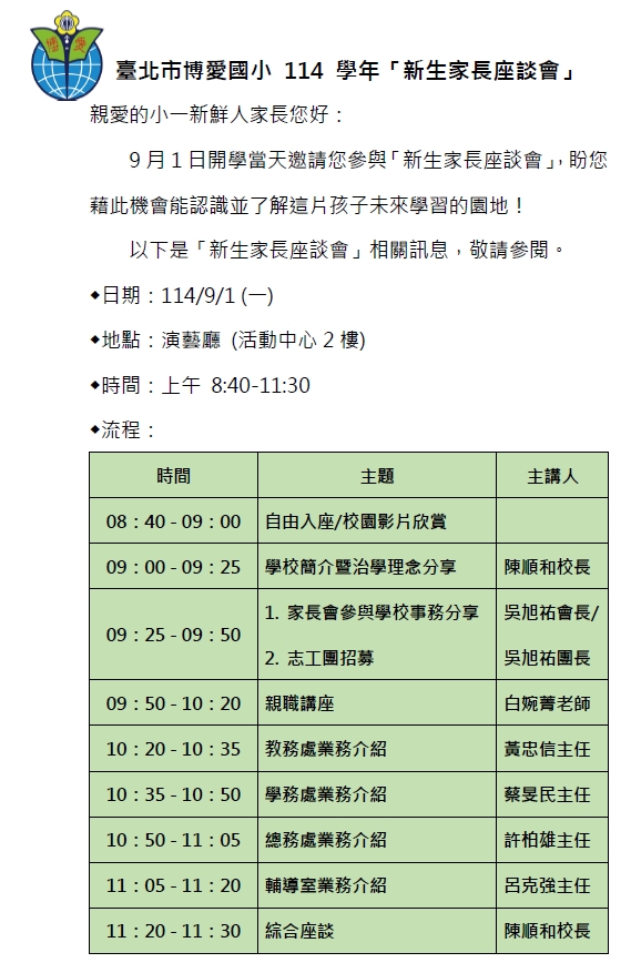 9/1 (一) 開學當天邀請您參與「新生家長座談會」,盼先讓您對博愛國小有更多的認識!