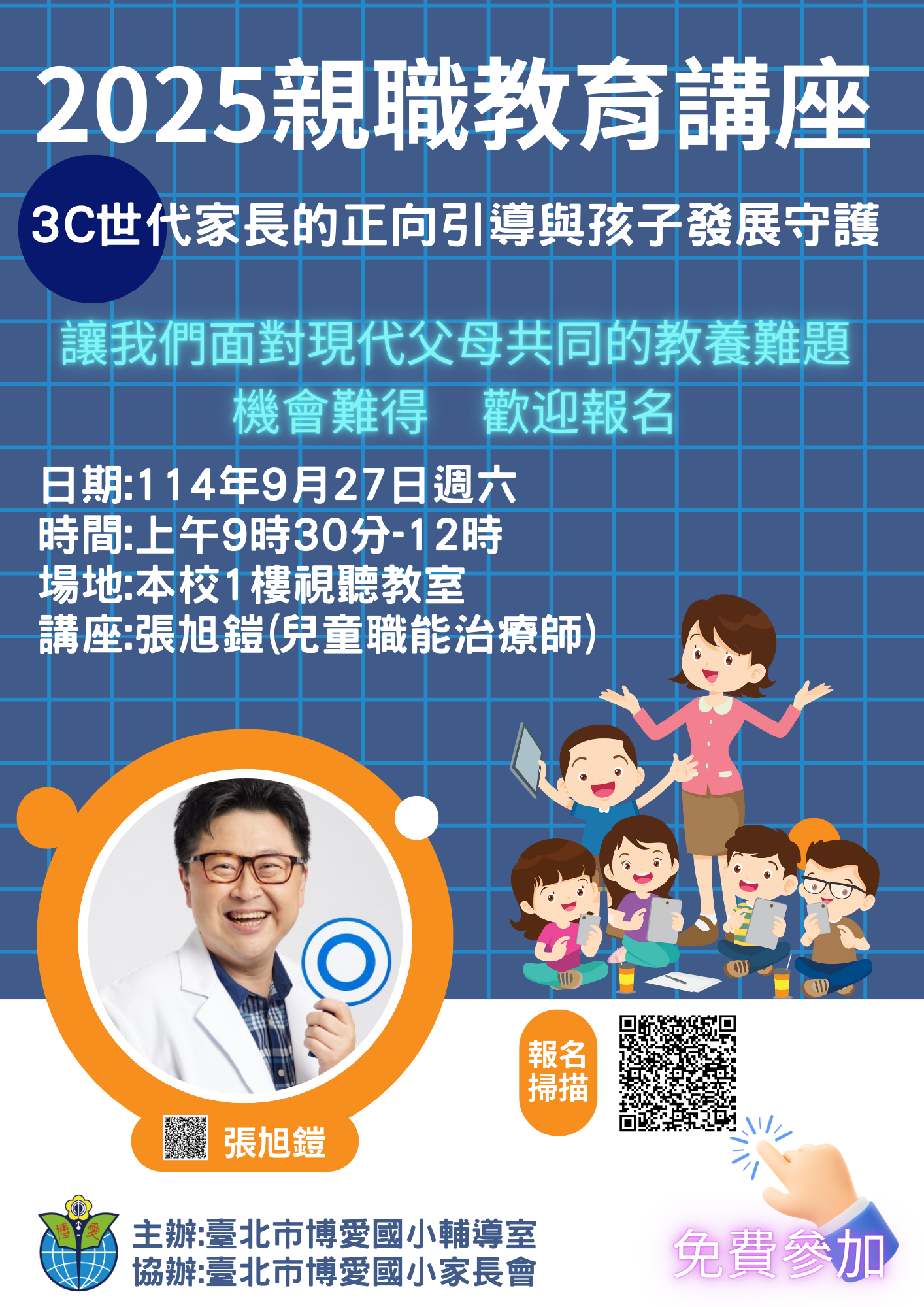 讓您不再徬徨…3C與教養… 最下方有報名連結或掃描海報上QR CODE登記參加!歡迎!時間:9月27日(週六)上午9:30至12:00地點:博愛國小1樓-視聽教室主題:3C世代家長的正向引導與孩子發展守護講師:張旭鎧 - 兒童職能治療師大綱: