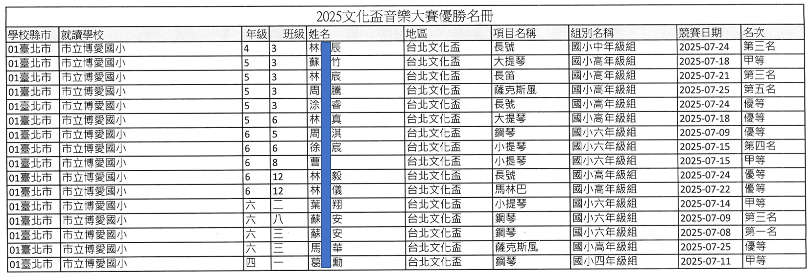 公告本校學生參加2025文化盃音樂大賽優勝名冊乙份如下: