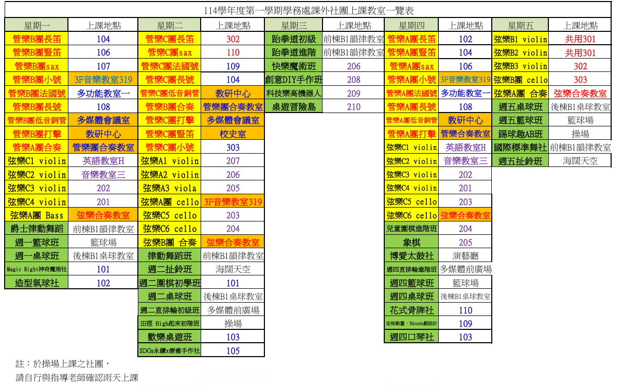 114-1課後社團上課地點如下,請參閱。下週9/8(一)開始上課,會將上課地點同步公告在前穿堂電視牆。