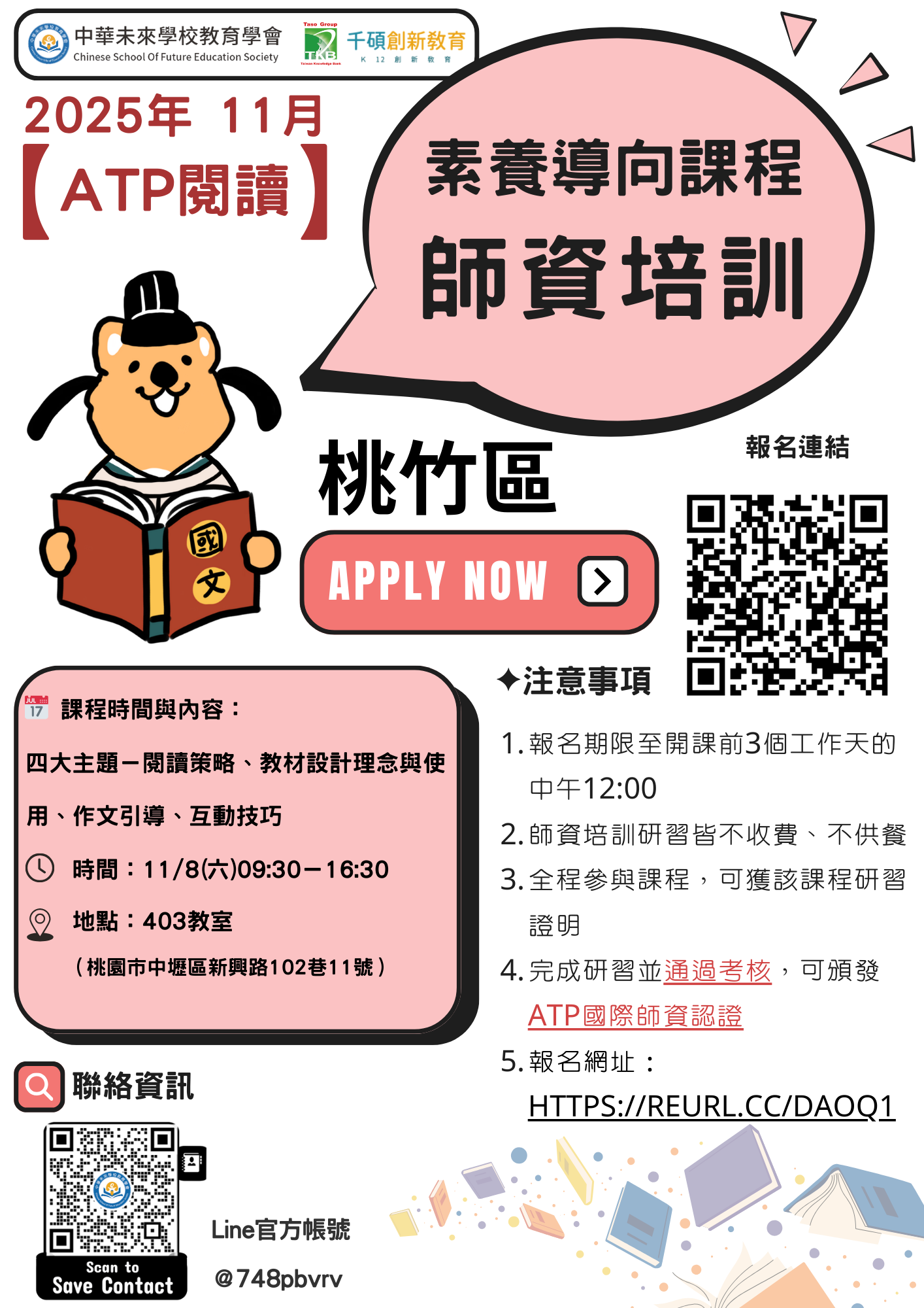 本次工作坊規劃四大主題,涵蓋素養導向理念:閱讀策略 教學、教材設計理念與使用教學、作文引導教學、互動技 巧教學等內容,以協助教師精進素養教學能力。