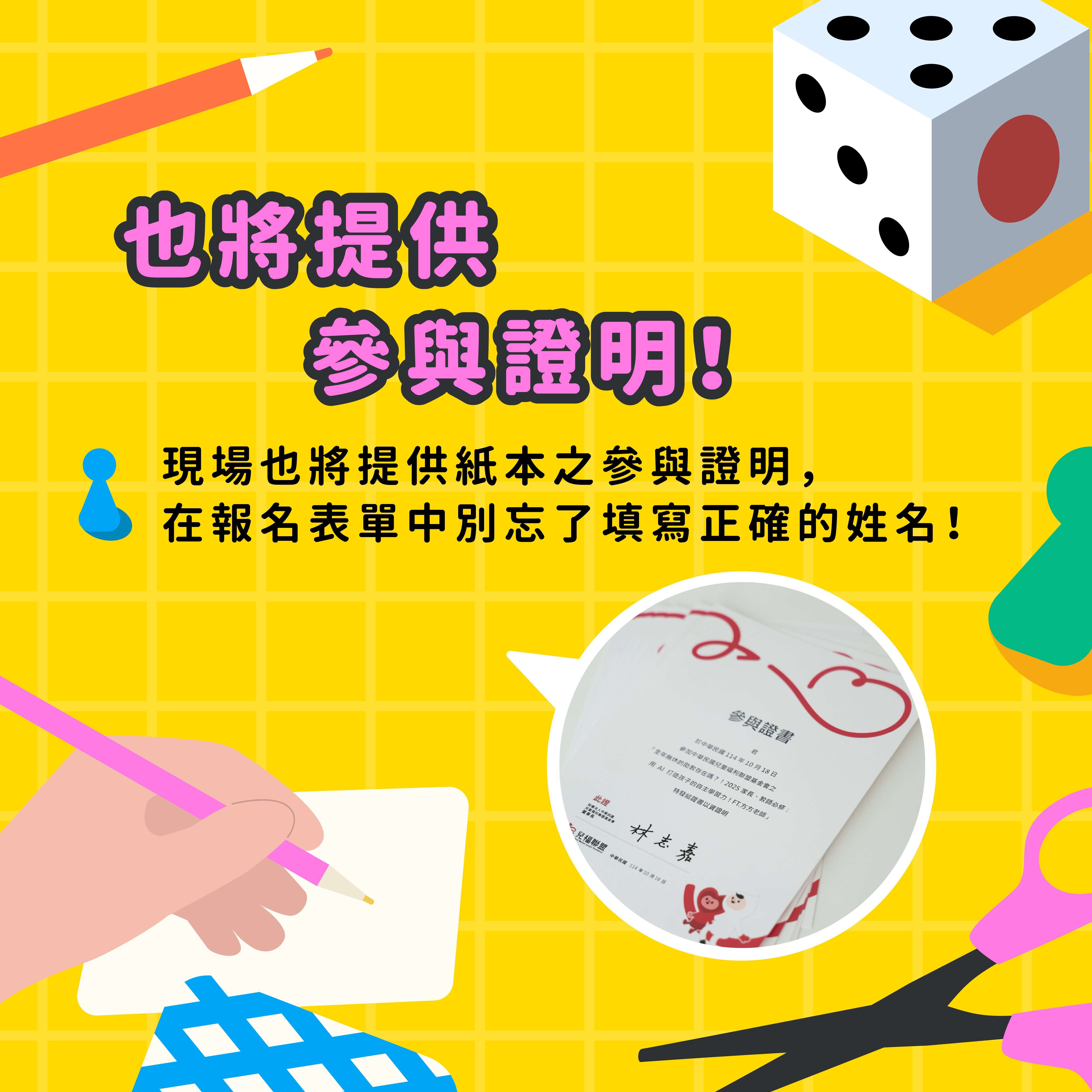 (一)本工作坊將提供於現場完整參與者紙本之參與證明,敬 請於報名表中填寫正確姓名