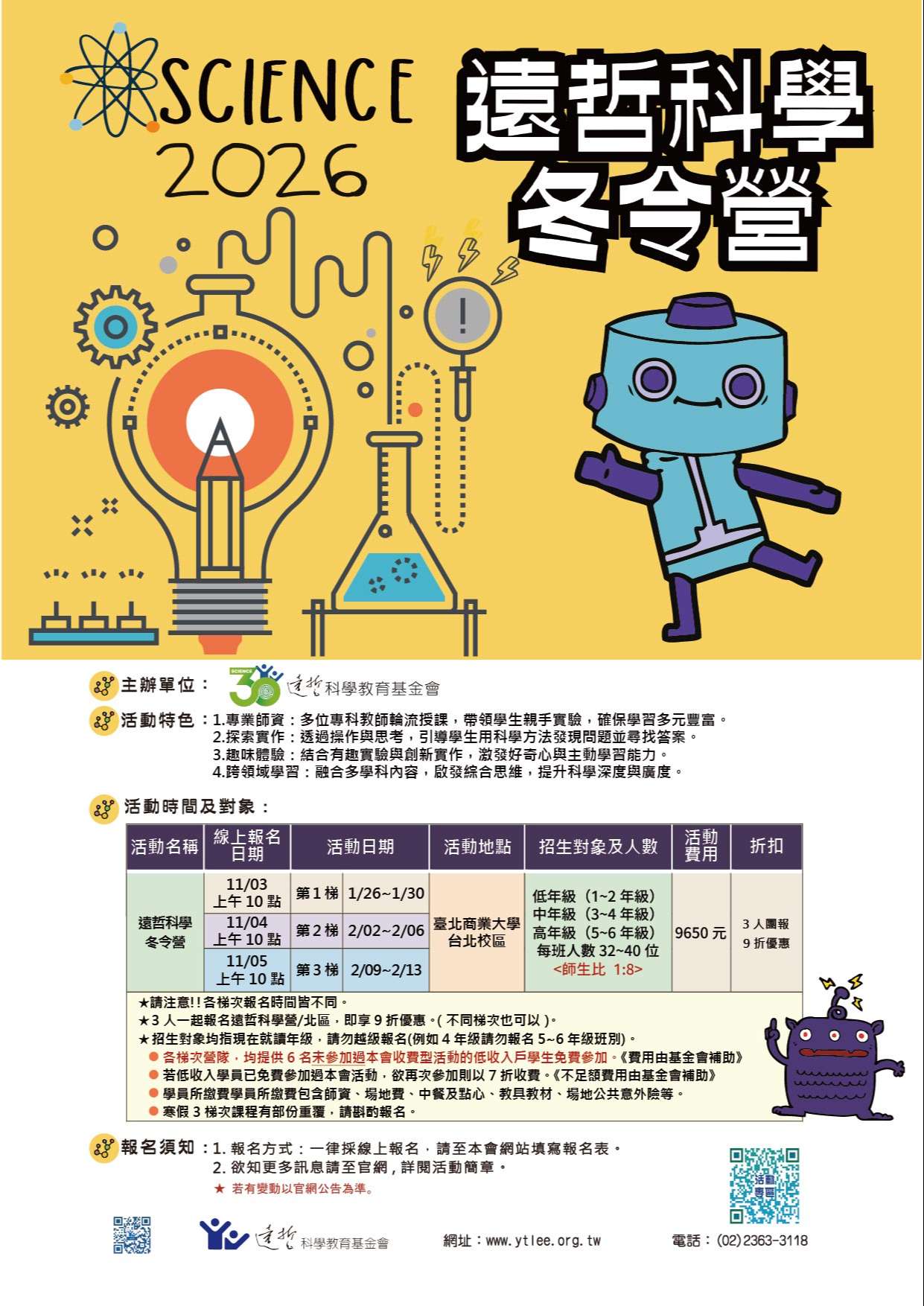 活動訂於民國115年1月26日至2月13日,假國立臺北商業大 學舉辦三個梯次之遠哲科學冬令營。