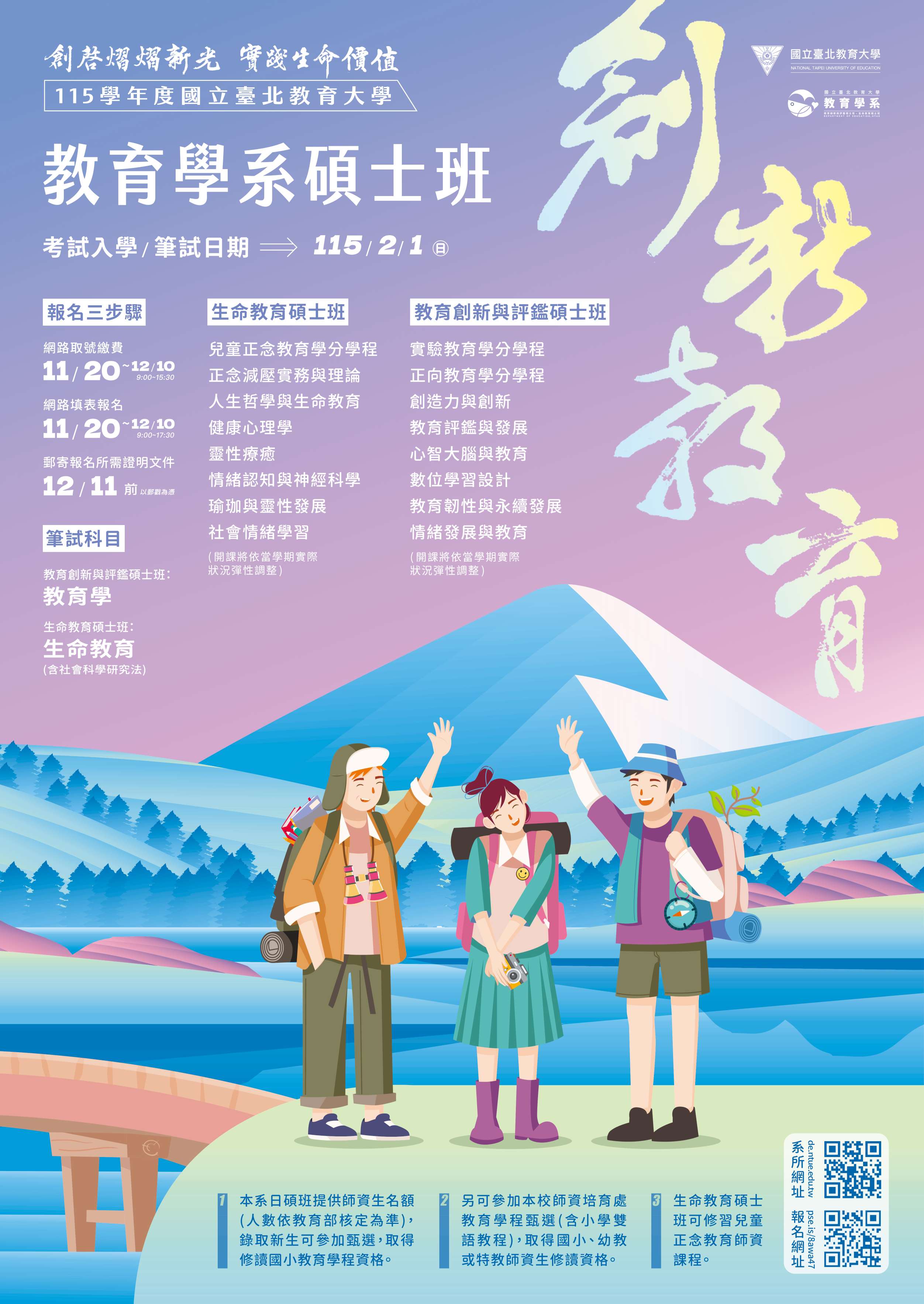 碩士班考試入學筆試日期為115年2月1日(日)。教育創 新與評鑑碩士班筆試科目:教育學;生命教育碩士班筆試 科目:生命教育(含社會科學研究法)。