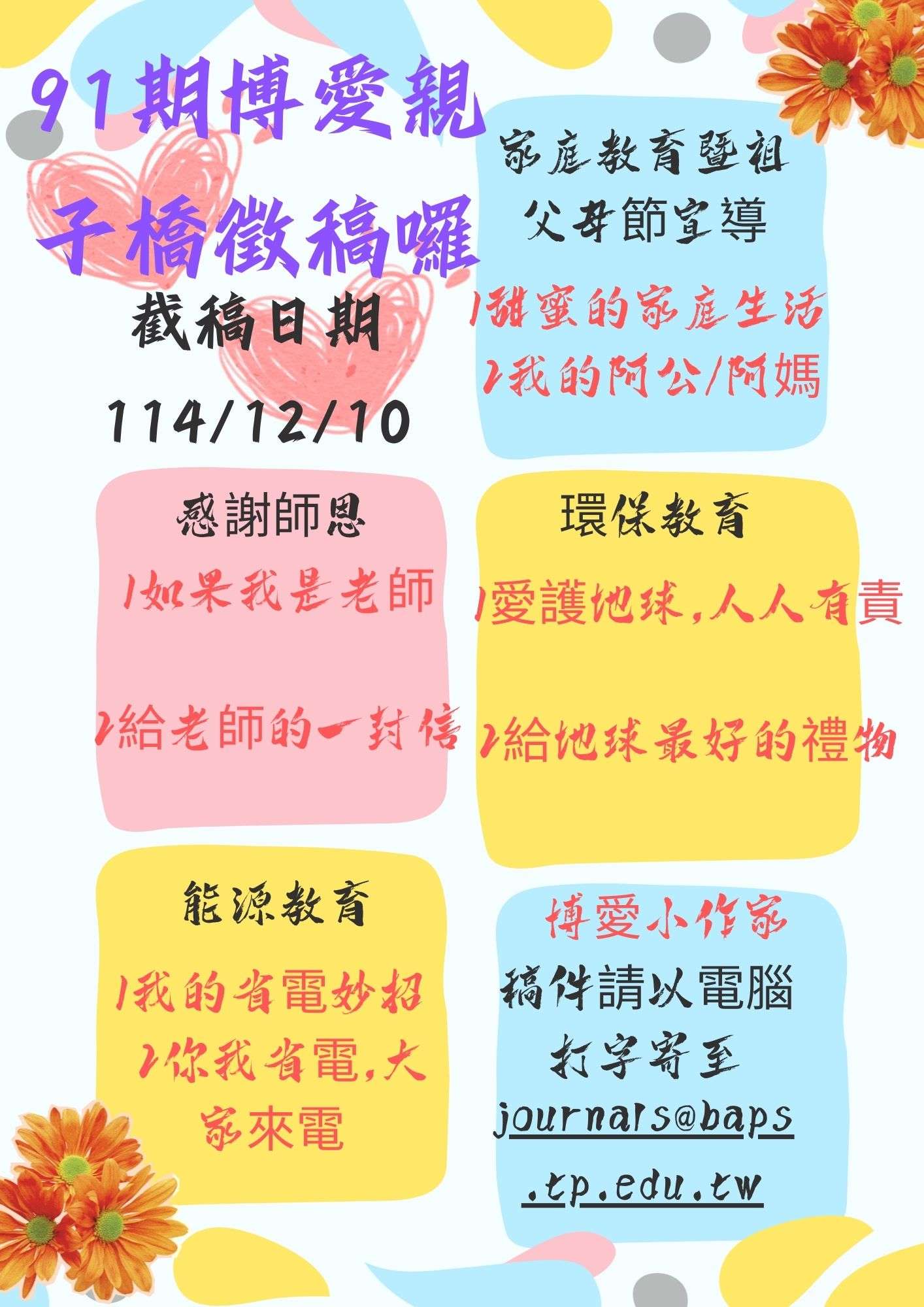 91期博愛親子橋即將於12/10截稿,請大家把握機會投稿喔