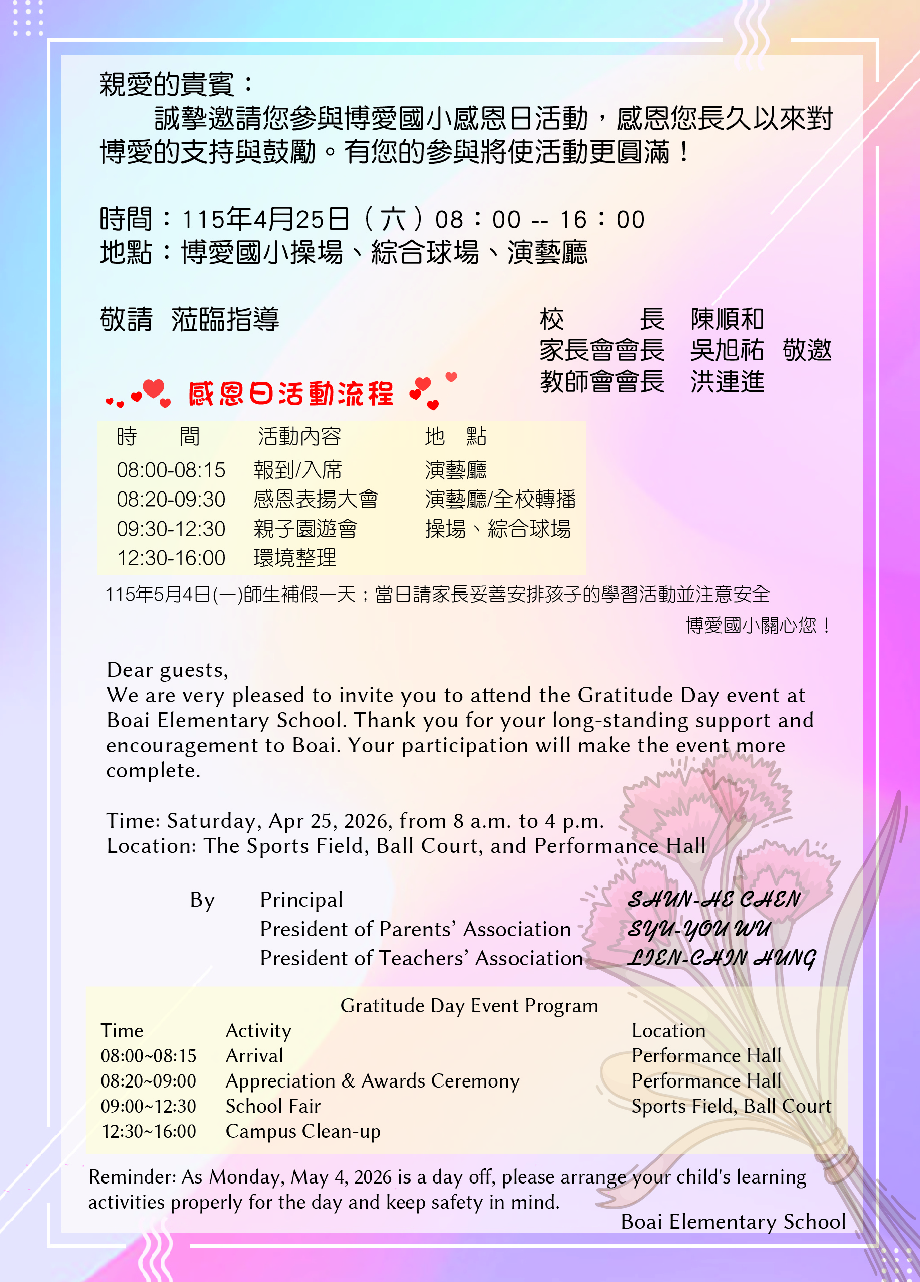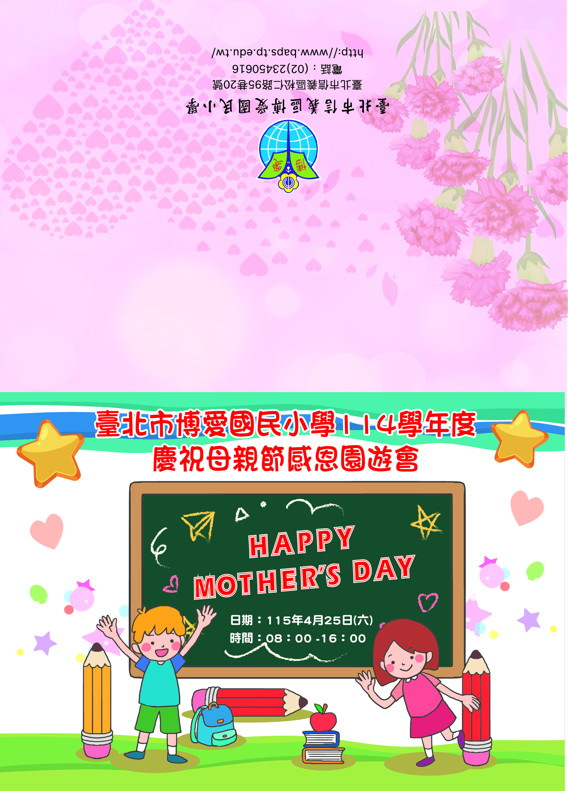 一年一度的感恩園遊會即將來臨,博愛國小全體師生在此誠摯的邀請家長們,在園遊會當天,帶著孩子和親朋好友,一同到學校來逛逛攤位,幫努力擺攤叫賣的老師和孩子們捧個場,體驗一下熱鬧的氛圍!