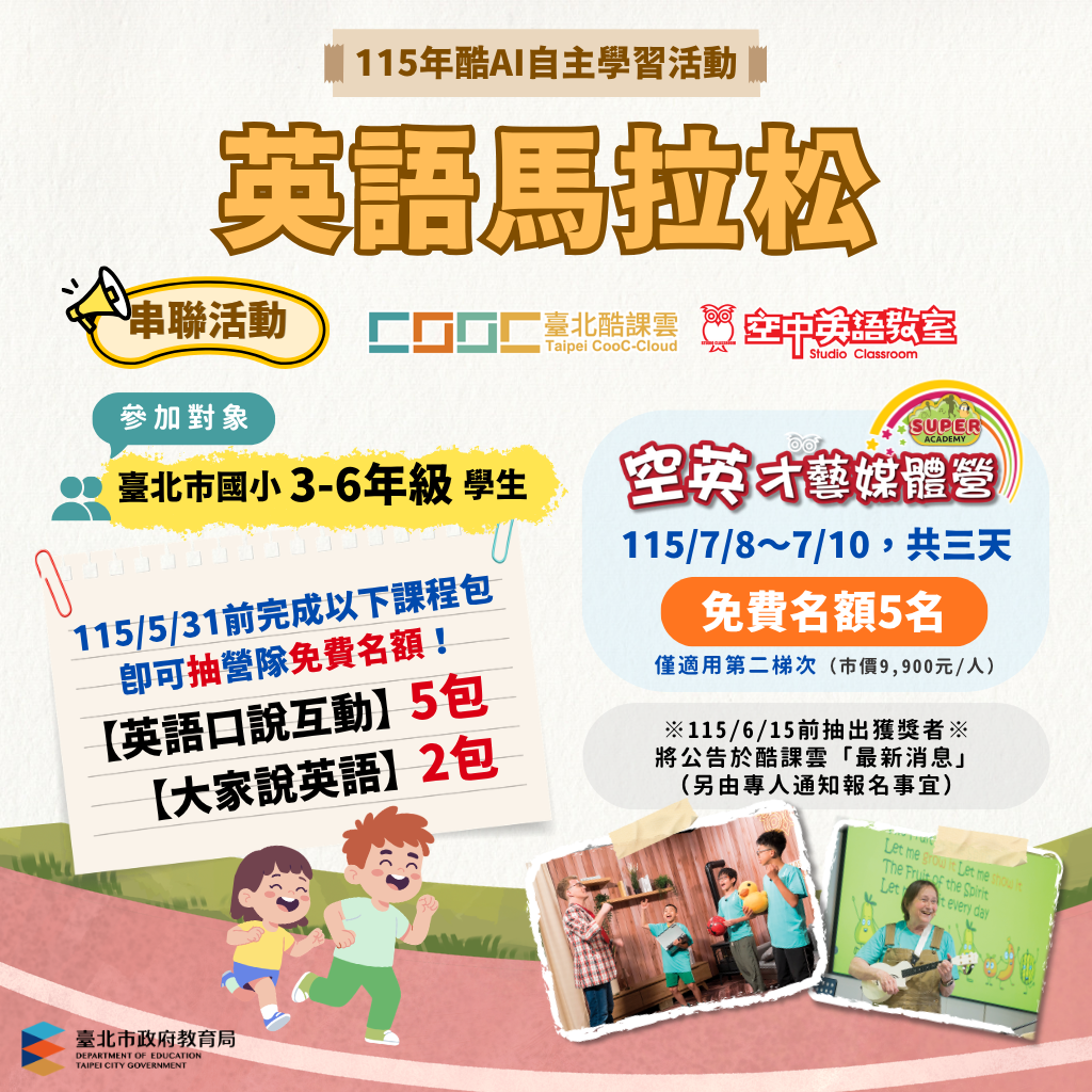 (一)活動對象:本市公私立國民小學3至6年級學生。 (二)學習任務獎勵:學生於115年5月31日前,完成酷AI「英 語互動口說」課程包5包及「大家說英語」課程包2包, 即可獲得加碼獎勵抽獎機會,將抽出營隊免費參加名額5名(備取10名,依序遞補),預計6月15日前抽出獲獎者 並公告於酷課雲最新消息,另由專人通知報名事宜。 (三)活動詳情可至酷課雲「最新消息」查看(連結: https://cooc.tp.edu.tw/news/566)。